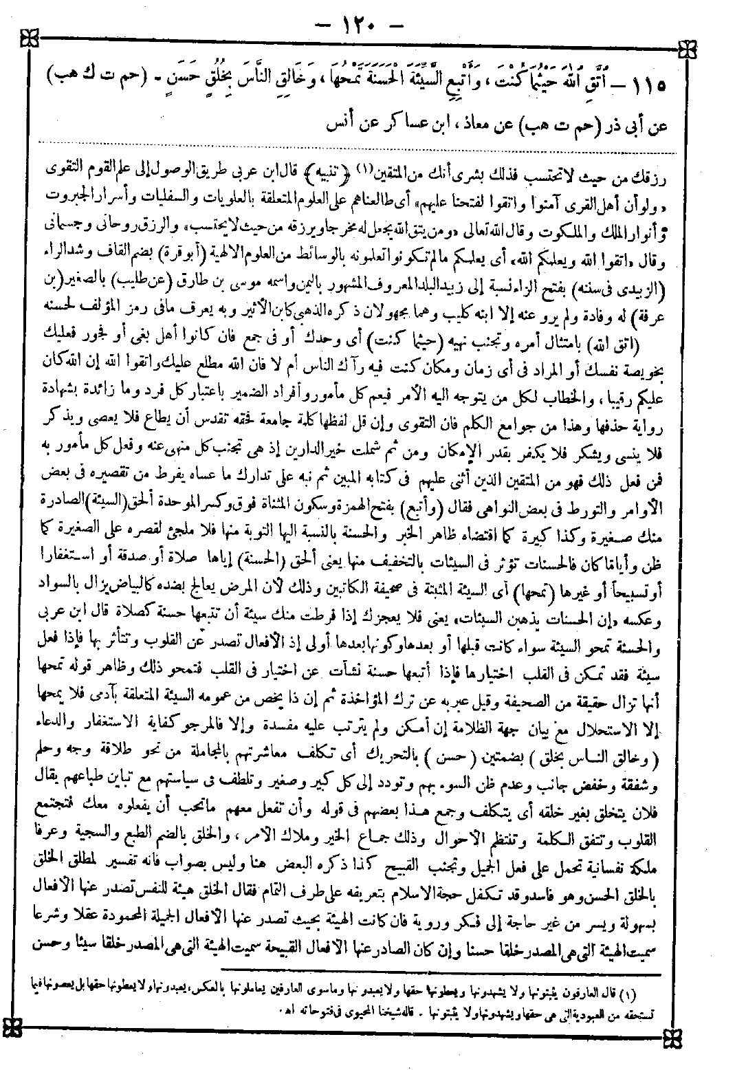 115 - (اتق الله) بامتثال أمره وتجنب نهيه (حيثما كنت) أي وحدك أو في جمع فإن كانوا أهل بغي أو فجور فعليك بخويصة نفسك أو المراد في أي زمان ومكان كنت فيه رآك الناس أم لا فإن الله مطلع عليك واتقوا الله إن الله كان عليكم رقيبا والخطاب لكل من يتوجه إليه الأمر فيعم كل مأمور وأفراد الضمير باعتبار كل فرد وما زائدة بشهادة رواية حذفها وهذا من جوامع الكلم فإن التقوى وإن قل لفظها كلمة جامعة فحقه تقدس أن يطاع فلا يعصى ويذكر فلا ينسى ويشكر فلا يكفر بقدر الإمكان ومن ثم شملت خير الدارين إذ هي تجنب كل منهي عنه وفعل كل مأمور به فمن فعل ذلك فهو من المتقين الذين أثنى عليهم في كتابه المبين ثم نبه على تدارك ما عساه يفرط من تقصيره في بعض الأوامر والتورط في بعض النواهي فقال (واتبع) بفتح الهمزة وسكون المثناة فوق وكسر الموحدة ألحق (السيئة) الصادرة منك صغيرة وكذا كبيرة كما اقتضاه ظاهر الخبر والحسنة بالنسبة إليها التوبة منها فلا ملجئ لقصره على الصغيرة كما ظن وأيا ما كان فالحسنات تؤثر في السيئات بالتخفيف منها يعني ألحق (الحسنة) إياها صلاة أو صدقة أو استغفارا أو تسبيحا أو غيرها (تمحها) أي السيئة المثبتة في صحيفة الكاتبين وذلك لأن المرض يعالج بضده كالبياض يزال بالسواد وعكسه {إن الحسنات يذهبن السيئات} يعني فلا يعجزك إذا فرطت منك سيئة أن تتبعها حسنة كصلاة قال ابن عربي: والحسنة تمحو السيئة سواء كانت قبلها أو بعدها وكونها بعدها أولى إذ الأفعال تصدر عن القلوب وتتأثر بها فإذا فعل سيئة فقد تمكن في القلب اختيارها فإذا أتبعها حسنة نشأت عن اختيار في القلب فتمحو ذلك وظاهر قوله تمحها أنها تزال حقيقة من الصحيفة وقيل عبر يه عن ترك المؤاخذة ثم إن ذا يخص من عمومه السيئة المتعلقة بآدمي فلا يمحها إلا الاستحلال مع بيان جهة الظلامة إن أمكن ولم يترتب عليه مفسدة وإلا فالمرجو كفاية الاستغفار والدعاء (وخالق الناس بخلق) بضمتين (حسن) بالتحريك أي تكلف معاشرتهم بالمجاملة من نحو طلاقة وجه وحلم وشفقة وخفض جانب وعدم ظن السوء بهم وتودد إلى كل كبير وصغير وتلطف في سياستهم مع تباين طباعهم يقال فلان يتخلق بغير خلقه أي يتكلف وجمع هذا بعضهم في قوله: وأن تفعل معهم ما تحب أن يفعلوه معك فتجتمع القلوب وتتفق الكلمة وتنتظم الأحوال وذلك جماع الخير وملاك الأمر والخلق بالضم الطبع والسجية وعرفا ملكة نفسانية تحمل على فعل الجميل وتجنب القبيح كذا ذكره البعض هنا وليس بصواب فإنه تفسير لمطلق الخلق بالخلق الحسن وهو فاسد وقد تكفل حجة الإسلام بتعريفه على طرف التمام فقال: الخلق هيئة للنفس تصدر عنها الأفعال بسهولة وسر من غير حاجة إلى فكر وروية فإن كانت الهيئة بحيث تصدر عنها الأفعال الجميلة المحمودة عقلا وشرعا سميت الهيئة التي هي المصدر خلقا حسنا وإن كان الصادر عنها الأفعال القبيحة سميت الهيئة التي هي المصدر خلقا سيئا وحسن -[121]- الخلق وإن كان جليا لكن في الحديث رمز إلى إمكان اكتسابه وإلا لما صح الأمر به كما سيجيء إيضاحه والأمر به عام خص بمستحقه فخرج الكفرة والظلمة فأغلظ عليهم ثم هذا الحديث من القواعد المهمة لإبانته لخير الدارين وتضمنه لما يلزم المكلف من رعاية حق الحق والخلق. وقال بعضهم: وهو جامع لجميع أحكام الشريعة إذ لا يخرج عنه شيء وقال آخر فصل فيه تفصيلا بديعا فإنه اشتمل على ثلاثة أحكام كل منها جامع في بابه ومترتب على ما قبله <تنبيه> قال الراغب: الفرق بين الخلق والتخلق أن التخلق معه استثقال واكتساب ويحتاج إلى بعث وتنشيط من خارج والخلق معه استخفاف وارتياح ولا يحتاج إلى بعث من خارج