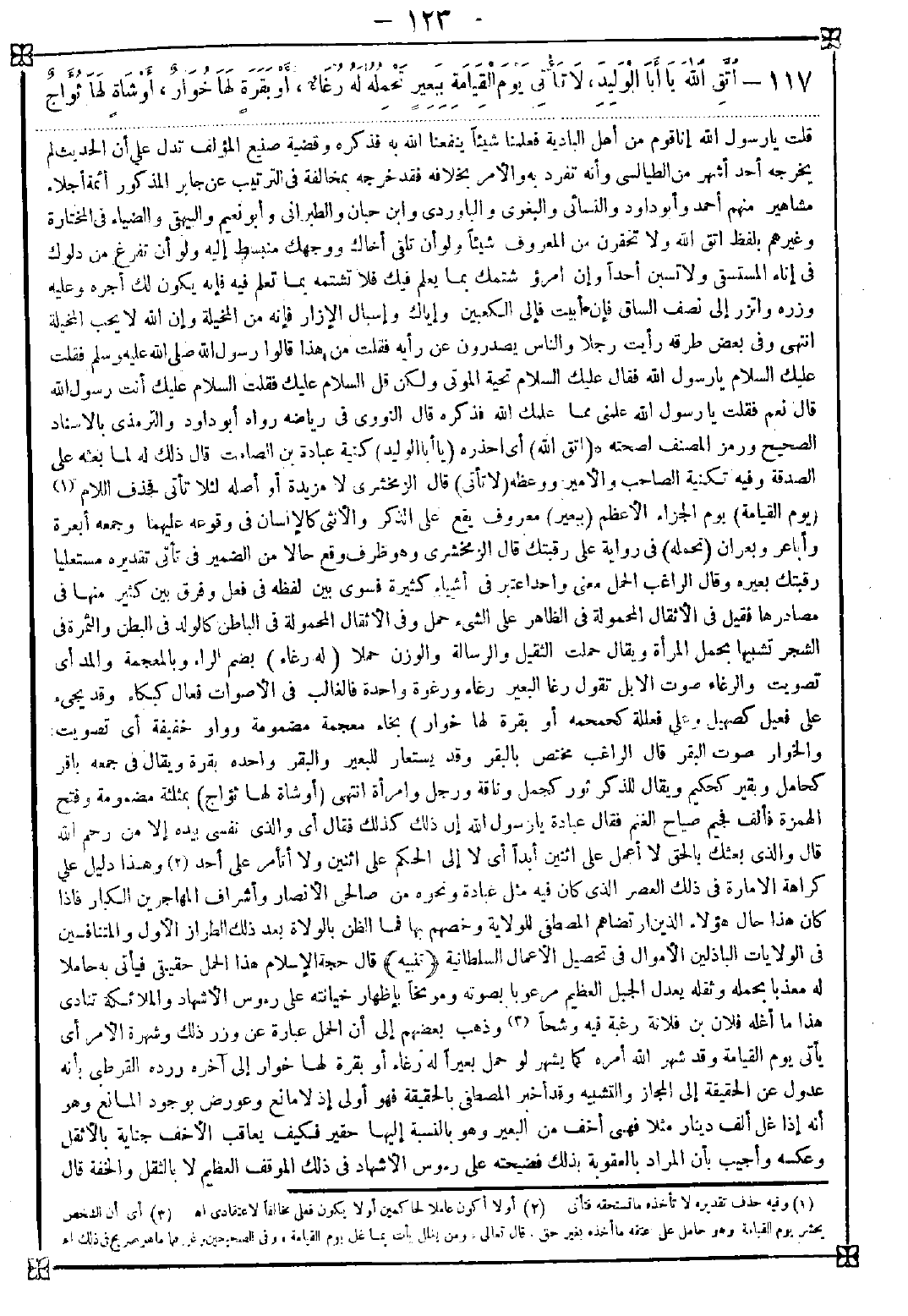 117 - (اتق الله) أي احذره (يا أبا الوليد) كنية عبادة بن الصامت قال ذلك له لما بعثه على الصدقة وفيه تكنية الصاحب والأمير ووعظه (لا تأتي) قال الزمخشري: لا مزيدة أو أصله لئلا تأتي فحذف اللام (وفيه حذف تقديره ما تستحقه فتأتي) (يوم القيامة) يوم الجزاء الأعظم (ببعير) معروف يقع على الذكر والأنثى كالإنسان في وقوعه عليهما وجمعه أبعره وأباعير وبعران (تحمله) في رواية على رقبتك قال الزمخشري: وهو ظرف وقع حالا من الضمير في تأتي تقديره مستعليا رقبتك بعيرة وقال الراغب: الحمل معنى واحد اعتبر في أشياء كثيرة فسوى بين لفظه في فعل وفرق بين كثير منها في مصادر فقيل في الأثقال المحمولة في الظاهر على الشيء حمل وفي الأثقال المحمولة في الباطن كالولد في البطن والثمرة في الشجر تشبيها بحمل المرأة ويقال حملت الثقيل والرسالة والوزن حملا (له رغاء) بضم الراء وبالمعجمة والمد أي تصويت والرغاء صوت الإبل تقول رغا البعير رغاء ورغوة واحدة فالغالب في الأصوات فعال كبكاء وقد يجيء على فعيل كصهيل وعلى فعلة كحمحمة (أو بقرة لها خوار) بخاء معجمة مضمومة وواو خفيفة أي تصويت والخوار صوت البقر قال الراغب: مختص بالبقر وقد يستعار للبعير والبقر واحدة بقرة ويقال في جمعه باقر كحامل وبقير كحكيم ويقال للذكر ثور كجمل وناقة ورجل وامرأة انتهى (أو شاة لها ثواج) بمثلثة مضمومة وفتح الهمزة فألف فجيم صياح الغنم فقال عبادة: يا رسول الله إن ذلك كذلك فقال: أي والذي نفسي بيده إلا من رحم الله قال: والذي بعثك بالحق لا أعمل على اثنين أبدا أي لا إلى الحكم على اثنين ولا أتأمر على أحد (أو لا أكون عاملا لحاكمين أو لا يكون فعلي مخالفا لاعتقادي أه)