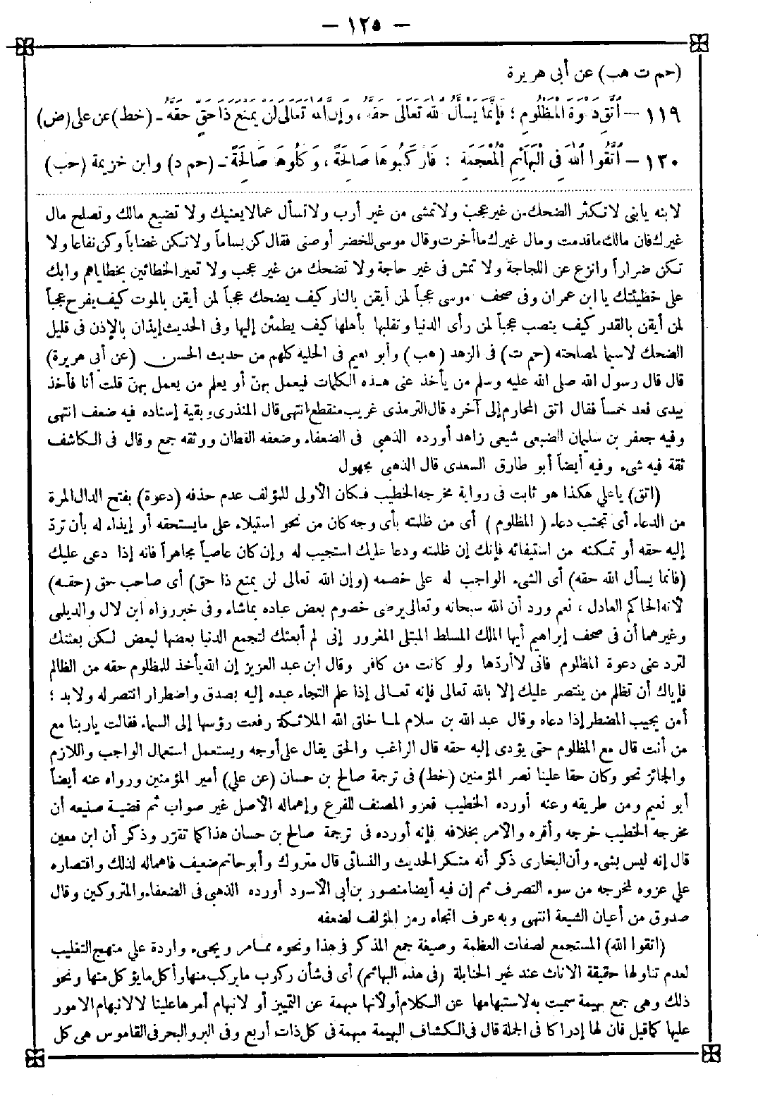 119 - (اتق) يا علي هكذا هو ثابت في رواية مخرجه الخطيب فكان الأولى للمؤلف عدم حذفه (دعوة) بفتح الدال المرة من الدعاء أي تجنب دعاء (المظلوم) أي من ظلمته بأي وجه كان من نحو استيلاء على ما يستحقه أو إيذاء له بأن ترد إليه حقه أو تمكنه من استيفائه فإنك إن ظلمته ودعا عليك استجيب له وإن كان عاصيا مجاهرا فإنه إذا دعى عليك (فإنما يسأل الله حقه) أي الشيء الواجب له على خصمه (وإن الله تعالى لن يمنع ذا حق) أي صاحب حق (حقه) لأنه الحاكم العادل نعم ورد أن الله سبحانه وتعالى يرضي خصوم بعض عباده بما شاء وفي خبر رواه ابن لال والديلمي وغيرهما أن في صحف إبراهيم أيها الملك المسلط المبتلى المغرور إني لم أبعثك لتجمع الدنيا بعضها لبعض لكن بعثتك لترد عني دعوة المظلوم فإني لا أردها ولو كانت من كافر وقال ابن عبد العزيز: إن الله يأخذ للمظلوم حقه من الظالم فإياك أن تظلم من ينتصر عليك إلا بالله تعالى فإنه تعالى إذا علم إلتجاء عبده إليه بصدق واضطرار انتصر له ولا بد {أمن يجيب دعوة المضطر إذا دعاه} وقال عبد الله بن سلام: لما خلق الله الملائكة رفعت رؤوسها إلى السماء فقالت: يا ربنا مع من أنت قال: مع المظلوم حتى يؤدى إليه حقه قال الراغب: والحق يقال على أوجه ويستعمل استعمال الواجب واللازم والجائز نحو {وكان حقا علينا نصر المؤمنين}