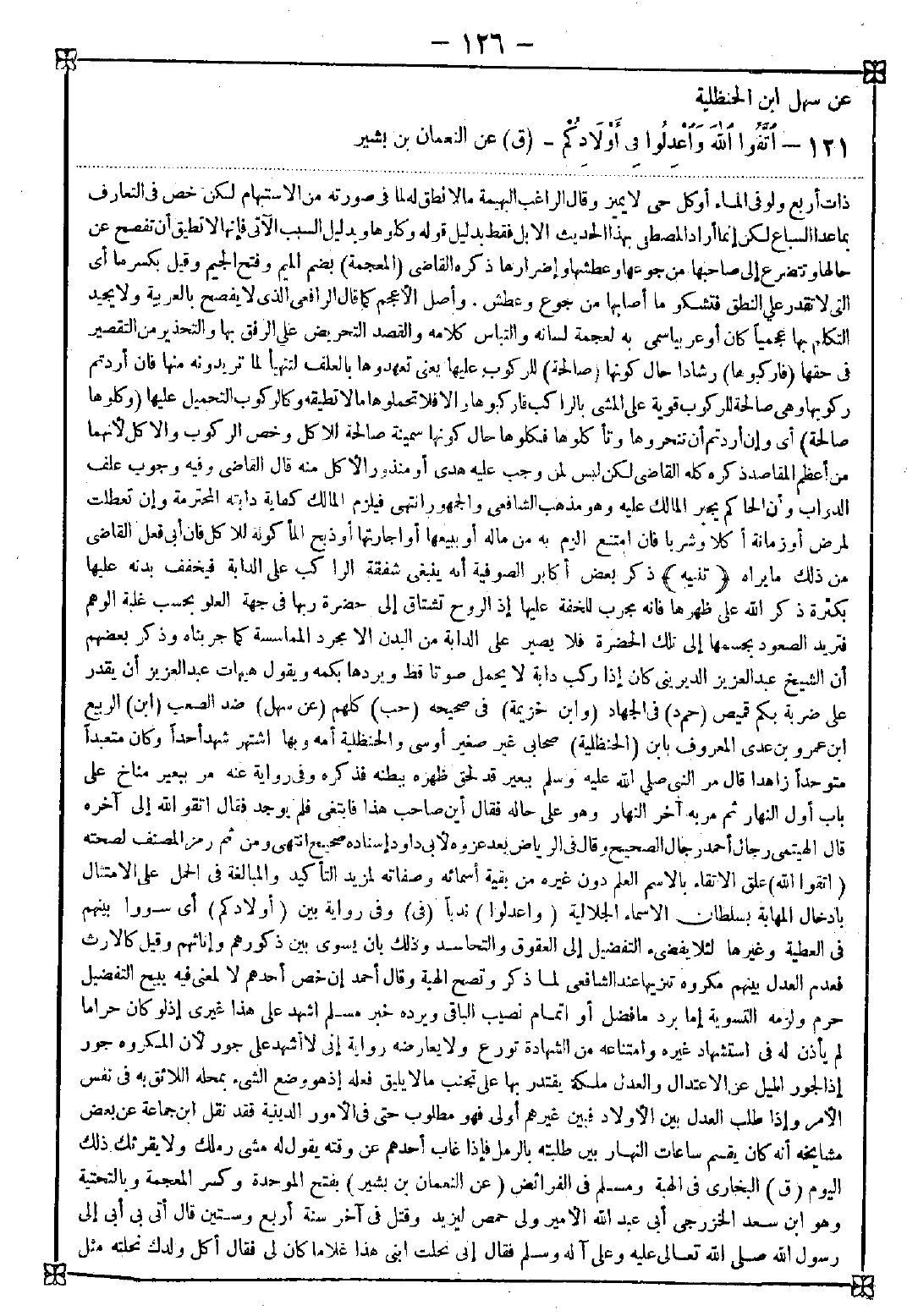 (ق) البخاري في الهبة ومسلم في الفرائض (عن النعمان بن بشير) بفتح الموحدة وكسر المعجمة وبالتحتية وهو ابن سعد الخزرجي أبي عبد الله الأمير ولي حمص ليزيد وقتل في آخر سنة أربع وستين قال: أتى بي أبي إلى رسول الله صلى الله تعالى عليه وعلى آله وسلم فقال: إني نحلت ابني هذا غلاما كان لي فقال: أكل ولدك نحلته مثل -[127]- هذا قال: لا قال: فارجعه وفي رواية فقال: أفعلت هذا بولدك كلهم قال: لا قال: اتقوا الله واعدلوا إلى آخره قال النعمان: فرجع بي فرد تلك الصدقة وفي رواية قال رسول الله صلى الله تعالى عليه وعلى آله وسلم: يا بشير ألك ولد سوى هذا قال: نعم قال: أكلهم وهبت له مثل هذا قال: لا قال: فلا تشهدني إذن فإني لا أشهد على جور وفي رواية أشهد على هذا غيري ثم قال: أيسرك أن يكونوا إليك في البر سواء قال: نعم قال: فلا إذن أخرجه الشيخان
