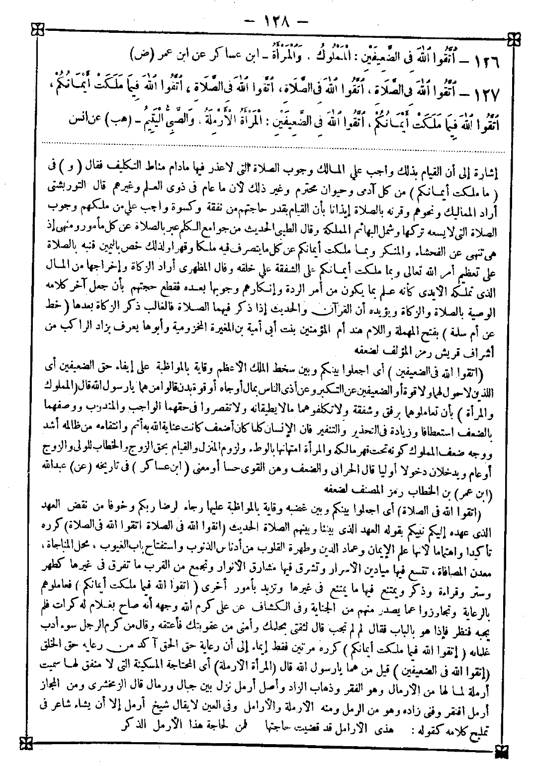 126 - (اتقوا الله في الضعيفين) أي اجعلوا بينكم وبين سخط الملك الأعظم وقاية بالمواظبة على إيفاء حق الضعيفين أي اللذين لا حول لهما ولا قوة أو الضعيفين عن التكبر وعن أذى الناس بمال أو جاه أو قوة بدن قالوا: من هما يا رسول الله قال: (المملوك والمرأة) بأن تعاملوهما برفق وشفقة ولا تكلفوهما ما لا يطيقانه ولا تقصروا في حقهما الواجب والمندوب ووصفهما بالضعف استعطافا وزيادة في التحذير والتنفير فإن الإنسان كلما كان أضعف كانت عناية الله به أتم وانتقامه من ظالمه أشد ووجه ضعف المملوك كونه تحت قهر مالكه والمرأة امتهانها بالوطء ولزوم المنزل والقيام بحق الزوج والخطاب للولي والزوج أو عام ويدخلان دخولا أوليا قال الحراني: والضعف وهن القوى حسا أو معنى