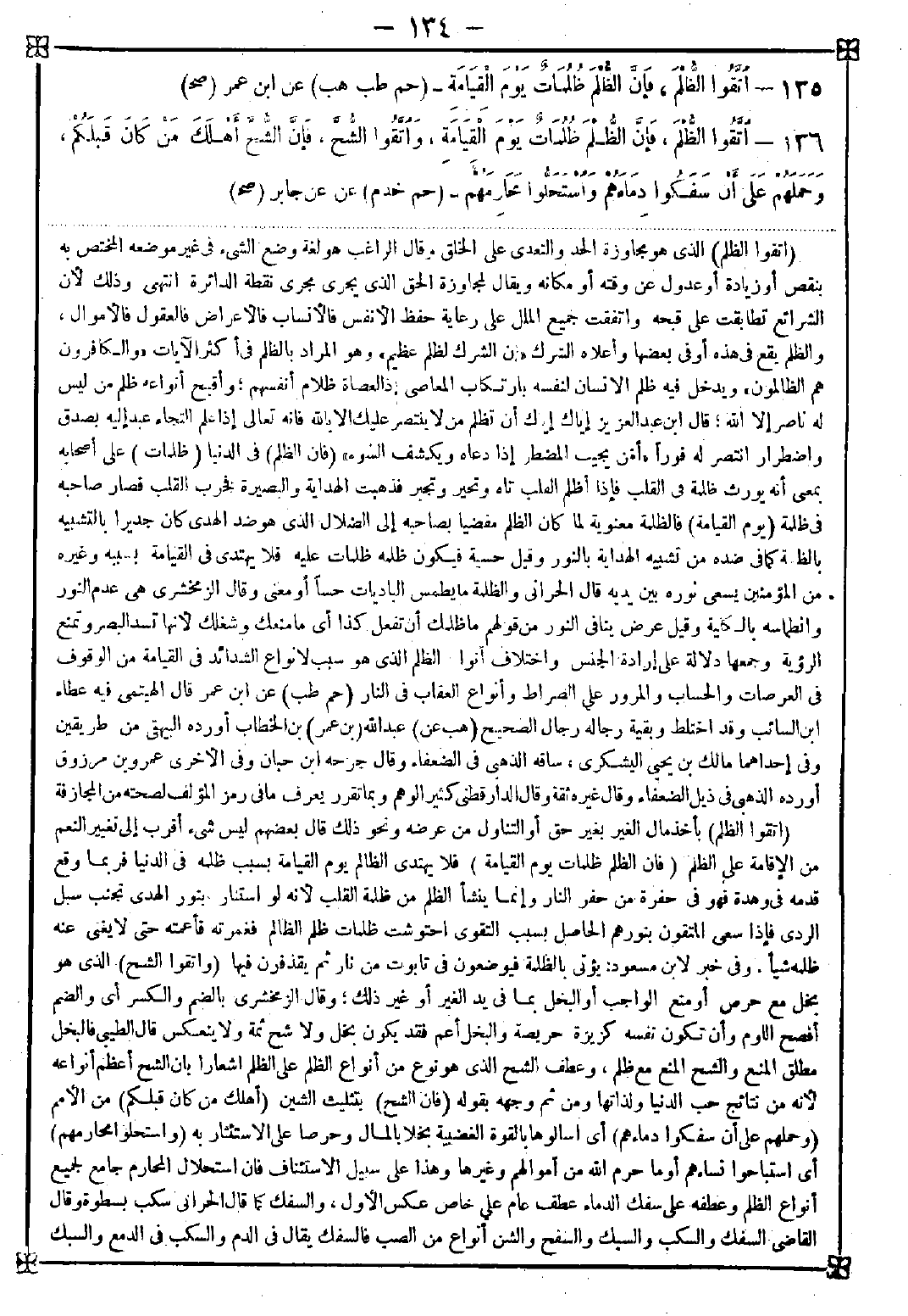 136 - (اتقوا الظلم) بأخذ مال الغير بغير حق أو التناول من عرضه ونحو ذلك قال بعضهم: ليس شيء أقرب إلى تغيير النعم من الإقامة على الظلم (فإن الظلم ظلمات يوم القيامة) فلا يهتدي الظالم يوم القيامة بسبب ظلمه في الدنيا فربما أوقع قدمه في وهدة فهو في حفرة من حفر النار وإنما ينشأ الظلم من ظلمة القلب لأنه لو استنار بنور الهدى تجنب سبل الردى فإذا سعى المتقون بنورهم الحاصل بسبب التقوى احتوشت ظلمات ظلم الظالم فغمرته فأعمته حتى لا يغني عنه ظلمه شيئا. وفي خبر لابن مسعود " يؤتى بالظلمة فيوضعون في تابوت من نار ثم يقذفون فيها (واتقوا الشح) الذي هو بخل مع حرص أو منع الواجب أو البخل بما في يد الغير أو غير ذلك وقال الزمخشري: بالضم والكسر أي والضم أفصح اللوم وأن تكون نفسه كزيزة حريصة والبخل أعم فقد يكون بخل ولا شح ثمة ولا ينعكس قال الطيبي: فالبخل مطلق المنع والشح المنع مع ظلم وعطف الشح الذي هو نوع من أنواع الظلم اشعارا بأن الشح أعظم أنواعه لأنه من نتائج حب الدنيا ولذاتها ومن ثم وجهه بقوله (فإن الشح) بتثليث الشين (أهلك من كان قبلكم) من الأمم (وحملهم على أن سفكوا دماءهم) أي اسالوها بالقوة الغضبية بخلا بالمال وحرصا على الاستئثار به (واستحلوا محارمهم) أي استباحوا نساءهم أو ما حرم الله من أموالهم وغيرها وهذا على سبيل الاستئناف فإن استحلال المحارم جامع لجميع أنواع الظلم وعطفه على سفك الدماء عطف عام على خاص عكس الأول والسفك كما قال الحراني سكب بسطوة وقال القاضي السفك والكسب والسبك والسفح والشن أنواع من الصب فالسفك يقال في الدم والسكب في الدمع والسبك -[135]- في الجواهر المذابة والسفح في الصب من أعلى والشن في الصب من فم القربة انتهى وإنما كان الشح سبب ما ذكر لأن في بذل المال والمواساة تحابيا وتواصلا وفي الإمساك تهاجر وتقاطع وذلك يجر إلى تشاجر وتغادر من سفك الدماء واستباحة المحارم. ومن السياق عرف أن مقصود الحديث بالذات ذكر الشح وذكر الظلم توطئة وتمهيدا لذكره وأبرزه في هذا التركيب إيذانا بشدة قبح الشح وأنه يفضي بصاحبه إلى أفظع المفاسد حيث جعله حاملا على سفك الدماء الذي هو أعظم الأفعال الذميمة وأخبث العواقب الوخيمة {ومن يوق شح نفسه فأولئك هو المفلحون} قال بعض العارفين: الشح مسابقة قدر الله ومن سابق قدر الله سبق ومغالبة لله ومن غالب الحق غلب وذلك لأن الحريص يريد أن ينال ما لم يقدر له فعقوبته في الدنيا الحرمان وفي الآخرة الخسران
