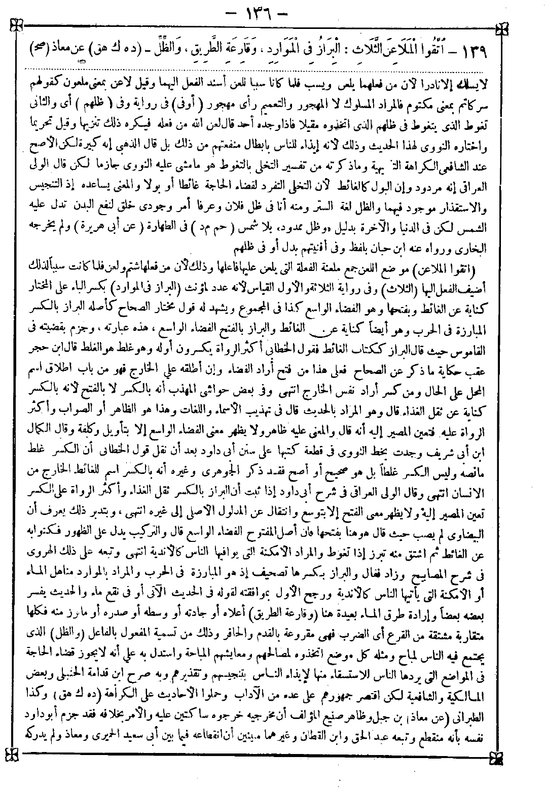 139 - (اتقوا الملاعن) موضع اللعن جمع ملعنة الفعلة التي ليعن عليها فاعلها وذلك لأن من فعلها شتم ولعن فلما كانت سببا لذلك أضيف الفعل إليها (الثلاث) وفي رواية الثلاثة والأول القياس لأنه عدد لمؤنث (البراز في الموارد) بكسر الباء على المختار كناية عن الغائط وبفتحها وهو الفضاء الواسع كذا في المجموع ويشهد له قول مختار الصحاح كأصله البراز بالكسر المبارزة في الحرب وهو أيضا كناية عن الغائط والبراز بالفتح الفضاء الواسع هذه عبارته وجزم بقضيته في القاموس حيث قال البراز ككتاب الغائط فقول الخطابي أكثر الرواة يكسرون أوله وهو غلط هو الغلط قال ابن حجر عقب حكاية ما ذكر عن الصحاح فعلى هذا من فتح أراد الفضاء وإن أطلقه على الخارج فهو من باب اطلاق اسم المحل على الحال ومن كسر أراد نفس الخارج انتهى وفي بعض حواشي المهذب أنه بالكسر لا بالفتح لأنه بالكسر كناية عن ثقل الغذاء قال وهو المراد بالحديث قال في تهذيب الأسماء واللغات وهذا هو الظاهر أو الصواب وأكثر الرواة عليه فتعين المصير إليه أنه قال والمعنى عليه ظاهر ولا يظهر معنى الفضاء الواسع إلا بتأويل وكلفة وقال الكمال ابن أبي شريف وجدت بخط النووي في قطعة كتبها على سنن أبي داود بعد أن نقل قول الخطابي أن الكسر علط ما نصه وليس الكسر غلطا بل هو صحيح أو أصح فقد ذكر الجوهري وغيره أنه بالكسر اسم للغائط الخارج من الإنسان انتهى وقال الولي العراقي في شرح أبي داود إذا ثبت أن البراز بالكسر ثقل الغذاء وأكثر الرواة على الكسر تعين المصير إليه ولا يظهر معنى الفتح إلا بتوسع وانتقال عن المدلول الأصلي إلى غيره انتهى وبتدبر ذلك يعرف أن البيضاوي لم يصب حيث قال هو هنا بفتحها فإن أصل المفتوح الفضاء الواسع قال والتركيب يدل على الظهور فكنوا به عن الغائط ثم اشتق منه تبرز إذا تغوط والمراد الأمكنة التي يوافيها الناس كالأندية انتهى وتبعه على ذلك الهروي في شرح المصابيح وزاد فقال: والبراز بكسرها تصحيف إذ هو المبارزة في الحرب والمراد بالموارد مناهل الماء أو الأمكنة التي يأتيها الناس كالأندية ورجح الأول بموافقته لقوله في الحديث الآتي أو في نقع ماء والحديث يفسر بعضه بعضا وإرادة طرق الماء بعيدة هنا (وقارعة الطريق) أعلاه أو جادته أو وسطه أو صدره أو ما برز منه فكلها متقاربة مشتقة من القرع أي الضرب فهي مقرعة بالقدم والحافر وذلك من تسمية المفعول بالفاعل (والظل) الذي يجتمع فيه الناس لمباح ومثله كل موضع اتخذوه لمصالحهم ومعايشهم المباحة واستدل به على أنه لا يجوز قضاء الحاجة في المواضع التي يردها الناس للاستسقاء منها لإيذاء الناس بتنجيسهم وتقذيرهم وبه صرح ابن قدامة الحنبلي وبعض المالكية والشافعية لكن اقتصر جمهورهم على عده من الآداب وحملوا الأحاديث على الكراهة