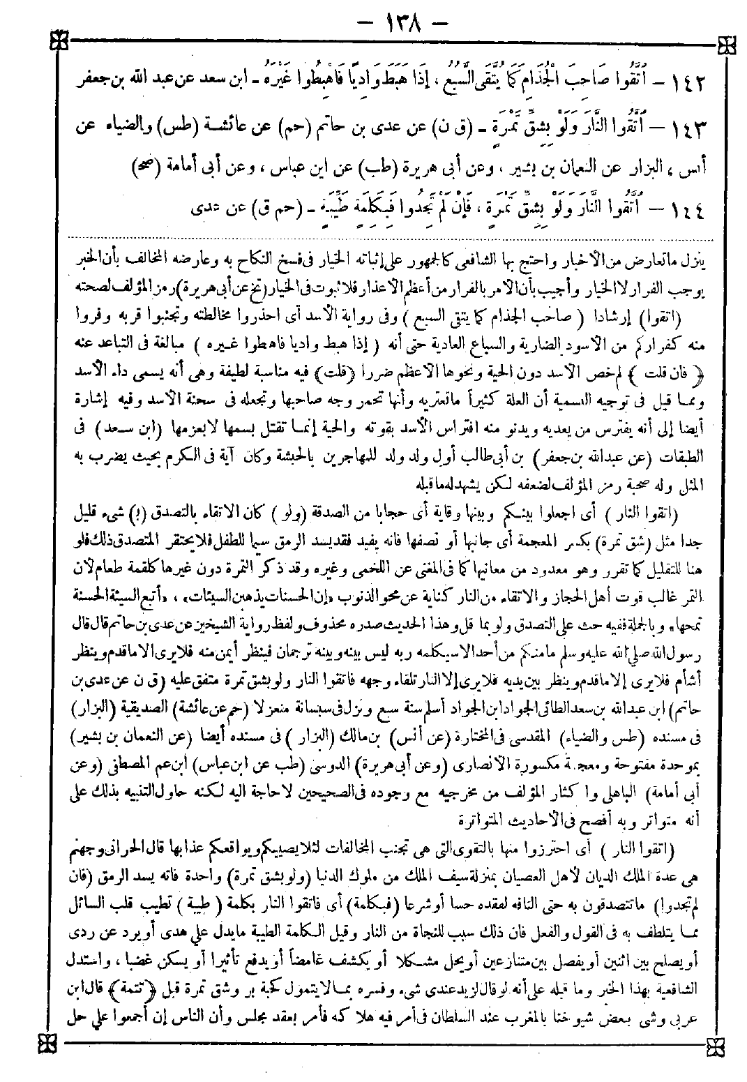143 - (اتقوا النار) أي اجعلوا بينكم وبينها وقاية أي حجابا من الصدقة (ولو) كان الاتقاء بالتصدق (ب) شيء قليل جدا مثل (شق تمرة) بكسر المعجمة أي جانبها أو نصفها فإنه يفيد فقد يسد الرمق للطفل فلا يحتقر المتصدق ذلك فلو هنا للتقليل كما تقرر وهو معدود من معانيها كما في المغني عن اللخمي وغيره وقد ذكر التمرة دون غيرها كلقمة طعام لأن التمر غالب قوت أهل الحجاز والاتقاء من النار كناية عن محو الذنوب {إن الحسنات يذهبن السيئات} " أتبع السيئة الحسنة تمحها " وبالجملة ففيه حث على التصدق ولو بما قل وهذا الحديث صدره محذوف ولفظ رواية الشيخين عن عدي بن حاتم قال قال رسول الله صلى الله عليه وسلم: ما منكم من أحد إلا سيكلمه ربه ليس بينه وبينه ترجمان فينظر أيمن منه فلا يرى إلا ما قدم وينظر أشأم منه فلا يرى إلا ما قدم وينظر بين يديه فلا يرى إلا النار تلقاء وجهه فاتقوا النار ولو بشق تمرة متفق عليه