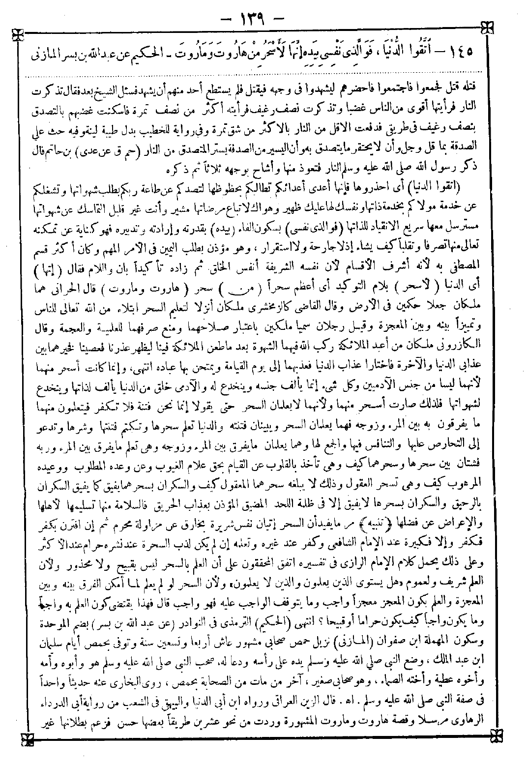 145 - (اتقوا الدنيا) أي احذروها فإنها أعدى أعدائكم تطالبكم بحظوظها لتصدكم عن طاعة ربكم بطلب شهواتها وتشغلكم عن خدمة مولاكم بخدمة ذاتها ونفسك لها عليك ظهير وهواك لاتباع مرضاتها مشير وأنت غير قليل التماسك عن شهواتها مسترسل معها سريع الانقياد للذاتها (فوالذي نفسي) بسكون الفاء (بيده) بقدرته وإرادته وتدبيره فهو كناية عن تمكنه تعالى منها تصرفا وتقلبا كيف يشاء إذ لا جارحة ولا استقرار وهو مؤذن بطلب اليمين في الأمر المهم وكان أكثر قسم المصطفى به لأنه أشرف الأقسام لأن نفسه الشريفة أنفس الخلق ثم زاده تأكيدا بأن واللام فقال (إنها) أي الدنيا (لأسحر) بلام التوكيد أي أعظم سحرا (من) سحر (هاروت وماروت) قال الحراني: هما ملكان جعلا حكمين في الأرض وقال القاضي كالزمخشري ملكان أنزلا لتعليم السحر ابتلاء من الله تعالى للناس وتمييزا بينه وبين المعجزة وقيل رجلان سميا ملكين باعتبار صلاحهما ومنع صرفهما للعلمية والعجمة وقال الكازوني ملكان من أعبد الملائكة ركب الله فهما الشهوة بعد ما طعن الملائكة فينا ليظهر عذرنا فعصينا فخيرهما بين عذابي الدنيا والآخرة فاختارا عذاب الدنيا فعذبهما إلى يوم القيامة ويمتحن بها عباده انتهى وإنما كانت أسحر منهما لأنهما ليسا من جنس الآدميين وكل شيء إنما يألف جنسه وينخدع له والآدمي خلق من الدنيا يألف لذاتها وينخدع لشهواتها فلذلك صارت أسحر منهما ولأنهما لا يعلمان السحر حتى يقولا إنما نحن فتنة فلا تكفر فيتعلمون منهما ما يفرقون به بين المرء وزوجه فهما يعلمان السحر ويبينان فتنته والدنيا تعلم سحرها وتكتم فتنتها وشرها وتدعو إلى التحارص عليها والتنافس فيها والجمع لها وهما يعلمان ما يفرق بين المرء وزوجه وهي تعلم ما يفرق بين المرء وربه فشتان بين سحرها وسحرهما كيف وهي تأخذ بالقلوب عن القيام بحق علام الغيوب وعن وعده المطلوب ووعيده المرهوب كيف وهي تسحر العقول وذلك لا يبلغه سحرهما المعقول كيف والسكران بسحرهما يفيق كما يفيق السكران بالرحيق والسكران بسحرها لا يفيق إلا في ظلمة اللحد المضيق المؤذن بعذاب الحريق فالسلامة منها تسليمها لأهلها والإعراض عن فضلها <تنبيه> مر ما يفيد أن السحر إتيان نفس شريرة بخارق عن مزاولة محرم ثم إن اقترن بكفر فكفر وإلا فكبيرة عند الإمام الشافعي وكفر عند غيره وتعلمه إن لم يكن لذب السحرة عند نشره حرام عند الأكثر وعلى ذلك يحمل كلام الإمام الرازي في تفسيره اتفق المحققون على أن العلم بالسحر ليس بقبيح ولا محذور ولأن العلم شريف ولعموم {هل يستوي الذين يعلمون والذين لا يعلمون} ولأن السحر لو لم يعلم لما أمكن الفرق بينه وبين المعجزة والعلم بكون المعجز معجزا واجب وما يتوقف الواجب عليه فهو واجب قال: فهذا يقتضي كون العلم به واجبا وما يكون واجبا كيف يكون حراما أو قبيحا؟ انتهى