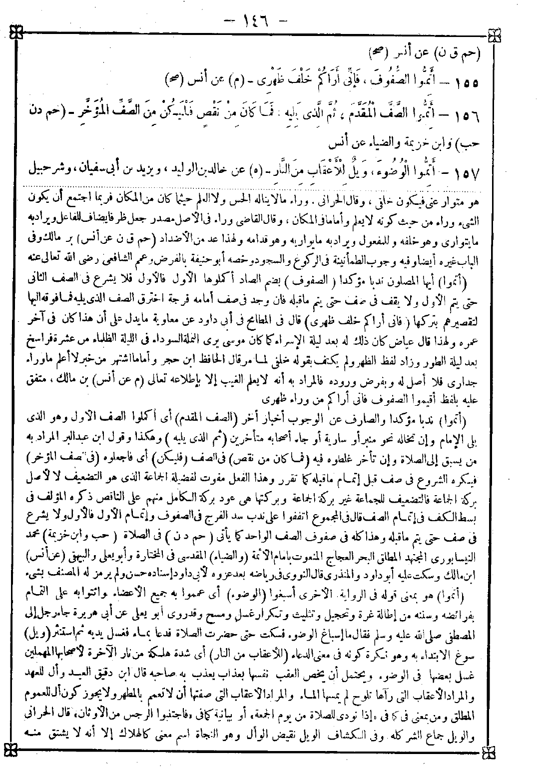 155 - (أتموا) أيها المصلون ندبا مؤكدا (الصفوف) بضم الصاد أكملوها الأول بالأول فلا يشرع في الصف الثاني حتى يتم الأول ولا يقف في صف حتى يتم ما قبله فإن وجد في صف أمامه فرجة اخترق الصف الذي يليه فما فوقه إليها لتقصيرهم بتركها (فإني أراكم خلف ظهري) قال في المطامح في أبي داود عن معاوية ما يدل على أن هذا كان في آخر عمره ولهذا قال عياض كان ذلك له بعد ليلة الإسراء كما كان موسى يرى النملة السوداء في الليلة الظلماء من عشرة فراسخ بعد ليلة الطور وزاد لفظ الظهر ولم يكتف بقوله خلفي لما مر قال الحافظ ابن حجر: وأما ما اشتهر من خبر لا أعلم ما وراء جداري فلا أصل له وبفرض وروده فالمراد به أنه لا يعلم الغيب إلا بإطلاعه تعالى