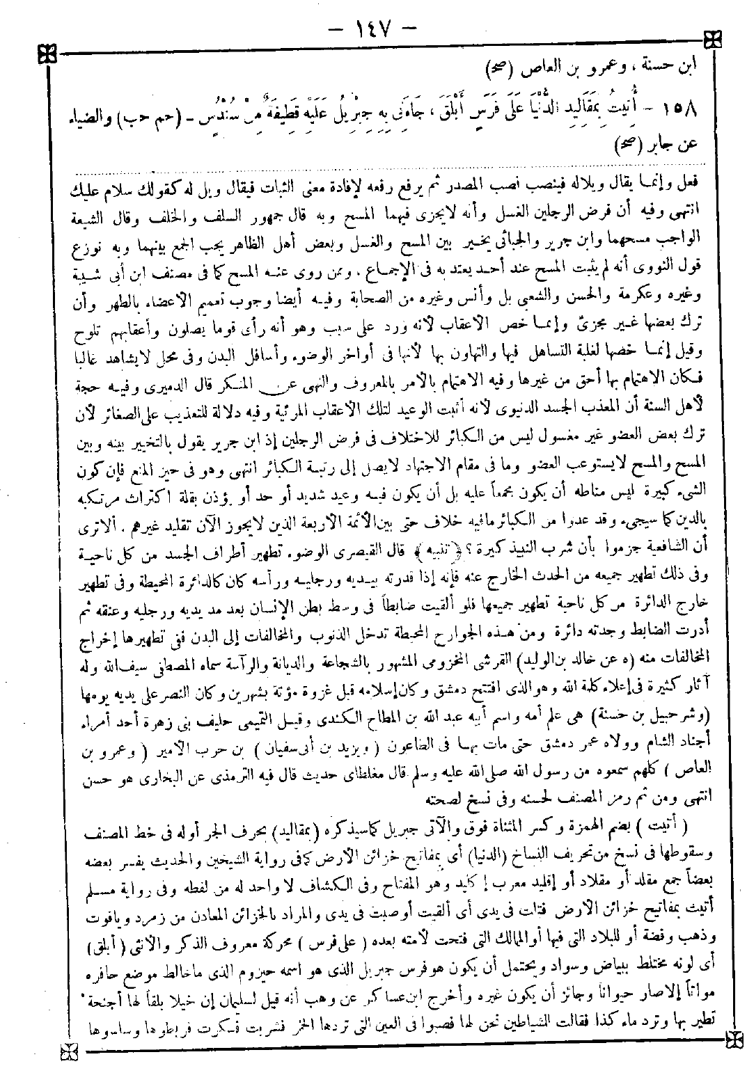 158 - (أتيت) بضم الهمزة وكسر المثناة فوق والآتي جبريل كما سيذكره (بمقاليد) بحرف الجر أوله في خط المصنف وسقوطها في نسخ من تحريف النساخ (الدنيا) أي بمفاتيح خزائن الأرض كما في رواية الشيخين والحديث يفسر بعضه بعضا جمع مقلد أو مقلاد أو إقليد معرب إكليد وهو المفتاح وفي الكشاف لا واحد له من لفظه وفي رواية مسلم أتيت بمفاتيح خزائن الأرض فتلت في يدي أي ألقيت أو صبت في يدي والمراد بالخزائن المعادن من زمرد وياقوت وذهب وفضة أو للبلاد التي فيها أو المماليك التي فتحت لأمته بعده (على فرس) محركة معروف الذكر والأنثى (أبلق) أي لونه مختلط ببياض وسواد ويحتمل أن يكون هو فرس جبريل الذي هو اسمه حيزوم الذي ما خالط موضع حافره مواتا إلا صار حيوانا وجائز أن يكون غيره وأخرج ابن عساكر عن وهب أنه قيل لسليمان إن خيلا بلقا لها أجنحة تطير بها وترد ماء كذا فقالت الشياطين نحن لها فصبوا في البين التي تردها الخمر فشربت فسكرت فربطوها وساسوها -[148]- حتى استأنست فجائز أن يكون هذا الفرس من ذلك النوع (جاءني بها جبريل) وفي رواية إسرافيل ولا تعارض لأن المجيء إذا كان متعددا فظاهر وإلا فالجائي به جبريل وصحبته إسرافيل خيره بين أن يكون نبيا عبدا أو نبيا ملكا فاختار الأول وترك التصرف في خزائن الأرض فعوض التصرف في خزائن السماء برد الشمس بعد غروبها وشق القمر ورجم النجوم واختراق السماوات وحبس المطر وإرساله وإرسال الرياح وإمساكها وتظليل الغمام وغير ذلك من الخوارق (عليه) أي جبريل ويحتمل الفرس (قطيفة) أي مجلل بقطيفة عظيمة كساء مربع له خمل (من سندس) بالضم ديباج رقيق وهو معرب اتفاقا وحكمة كون الحامل فرسا الإشارة إلى أنه أوتي العز إذ الخيل عز كما جاء في عدة أخبار سيجئ بعضها وكونه أبلق ولم يكن لونا واحدا إشارة إلى استيلاء أمته على خزائن جميع ملوك الطوائف من أحمر وأسود وأبيض على اختلاف ألوانها وأشكالها وقد صرح الزمخشري بما محصوله أن الخزائن في هذا وما أشبهه من قبيل التمثيل والاستعارة ففي الكشاف في قوله سبحانه وتعالى {وإن من شيء إلا عندنا خزائنه} ذكر الخزائن تمثيل والمعنى وما من شيء ينتفع به العباد إلا ونحن قادرون على إيجاده وتكوينه والإنعام به فضرب الخزائن مثلا لاقتداره على كل مقدور عليه فتكون المقاليد والفرس كذلك