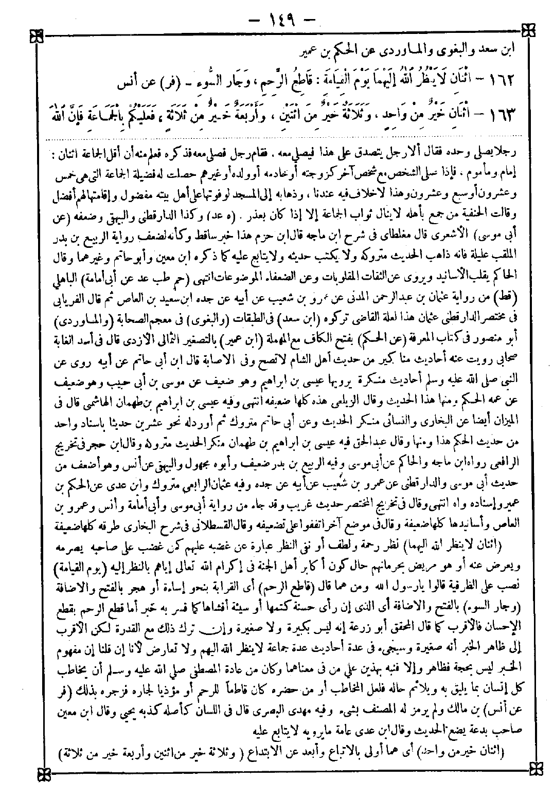 163 - (اثنان خير من واحد) أي هما أولى بالاتباع وأبعد عن الابتداع (وثلاثة خير من اثنين وأربعة خير من ثلاثة) -[150]- وهكذا كلما زاد فهو خير (فعليكم بالجماعة) أي الزموا السواد الأعظم من أهل الإسلام (فإن الله لم يجمع أمتي) أمة الإجابة (إلا على هدى) أي حق وصواب ومن خصائصها أن إجماعهم حجة وأنهم لا يجتمعون على ضلال كما يصرح به وصفه سبحانه لهم بأنهم يأمرون بالمعروف وينهون عن المنكر لأن مقتضى كونهم آمرين بكل معروف ناهين عن كل منكر إذ اللام للاستغراق أن لا يجتمعوا على باطل إذ لو اجتمعوا عليه كان أمرهم على خلاف ذلك ولذلك كان إجماعهم حجة