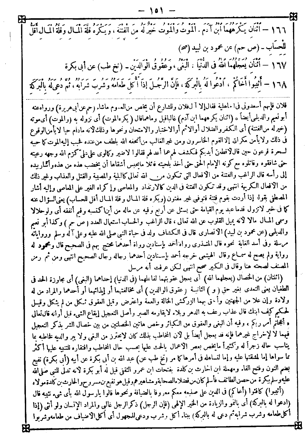 166 - (اثنان يكرههما ابن آدم) غالبا قيل: وما هما قال: (يكره الموت) أي نزوله به (والموت) أي موته (خير له من الفتنة) أي الكفر والضلال أو الإثم أو الاختبار والامتحان ونحوهما وذلك لأنه مادام حيا لا يأمن الوقوع في ذلك ولا يأمن مكر الله إلا القوم الخاسرون ومن غير الغالب من أتحفه الله بلطف من عنده فحبب إليه الموت كما حببه لسحرة فرعون حين قال لأقطعن أيديكم فكشف لهم عما أعد لهم فقالوا لا ضير وكما لوى على علي كرم الله وجهه رعيته حتى شاقوه وقاتلوه مع كونه الإمام الحق حتى أخذ بلحيته قائلا: ما يحبس أشقاها أن يخضب هذه من هذه وأشار بيده إلى رأسه. قال الراغب: والفتنة من الأفعال التي تكون من الله تعالى كالبلية والمصيبة والقتل والعذاب وغير ذلك من الأفعال الكريهة انتهى وقد تكون الفتنة في الدين كالارتداد والمعاصي وإكراه الغير على المعاصي وإليه أشار المصطفى بقوله " إذا أردت بقوم فتنة فتوفني غير مفتون (ويكره قلة المال وقلة المال أقل للحساب) يعني السؤال عنه كما في خبر " لا تزول قدما عبد يوم القيامة حتى يسئل عن أربع " وفيه عن ماله من أين اكتسبه وفيم أنفقه أي ولو حلالا وسمى المال مالا لأنه يميل القلوب عن الله تعالى قال الراغب: والحساب استعمال العدد