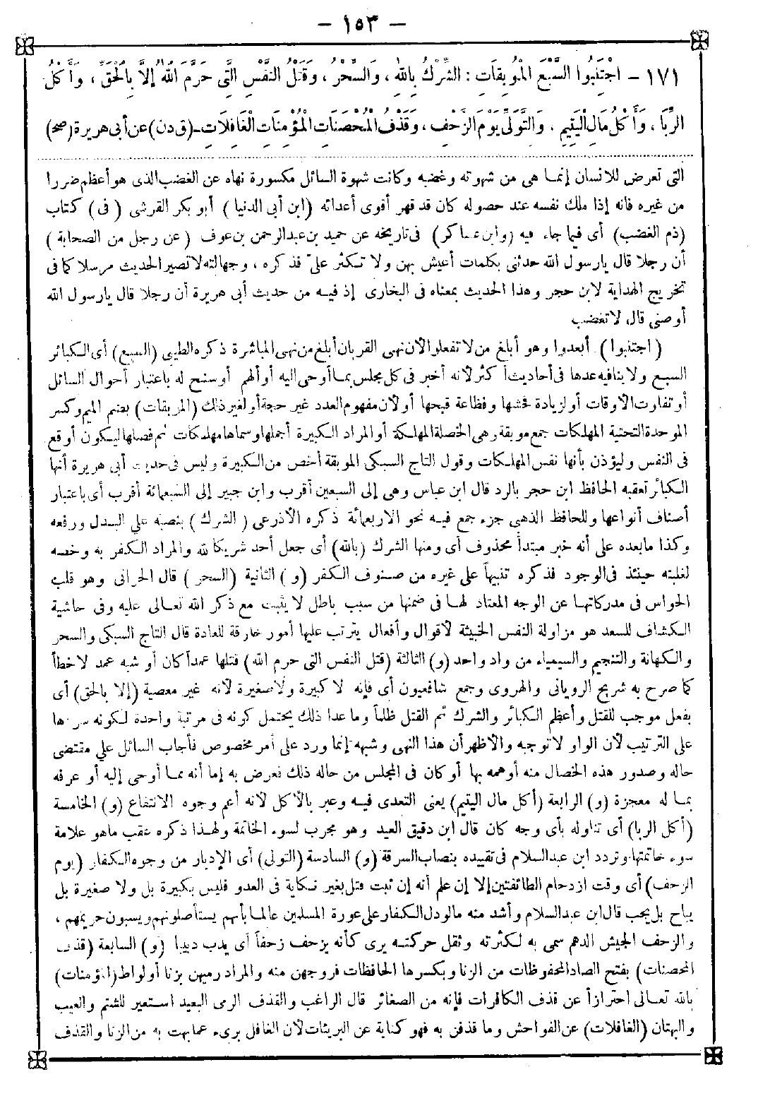 171 - (اجتنبوا) أبعدوا وهو أبلغ من لا تفعلوا لأن نهي القربان أبلغ من نهي المباشرة ذكره الطيبي (السبع) أي الكبائر السبع ولا ينافيه عدها في أحاديث أكثر لأنه أخبر في كل مجلس بما أوحى إليه أو ألهم أو سنح له باعتبار أحوال السائل أو تفاوت الأوقات أو لزيادة فحشها وفظاظة قبحها أو لأن مفهوم العدد غير حجة أو لغير ذلك (الموبقات) بضم الميم وكسر الموحدة التحتية المهلكات جمع موبقة وهي الخصلة المهلكة أو المراد الكبيرة أجملها وسماها مهلكات ثم فصلها ليكون أوقع في النفس وليؤذن بأنها نفس المهلكات وقول التاج السبكي الموبقة أخص من الكبيرة وليس في حديث أبي هريرة أنها الكبائر تعقبه الحافظ ابن حجر بالرد قال ابن عباس وهي إلى السبعين أقرب وابن جبير إلى السبع مئة أقرب أي باعتبار أصناف أنواعها وللحافظ الذهبي جزء فيه نحو الأربع مئة ذكره الأذرعي (الشرك) بنصبه على البدل ورفعه وكذا ما بعده على أنه خبر مبتدأ محذوف أي ومنها الشرك (بالله) أي جعل أحد شريكا لله والمراد الكفر به وخصه لغلبته حينئذ في الوجود فذكره تنبيها على غيره من صنوف الكفر (و) الثانية (السحر) قال الحراني: وهو قلب الحواس في مدركاتها عن الوجه المعتاد لها في ضمنها من سبب باطل لا يثبت مع ذكر الله تعالى عليه وفي حاشية الكشاف للسعد هو مزاولة النفس الخبيثة لأقوال وأفعال يترتب عليها أمور خارقة للعادة قال التاج السبكي والسحر والكهانة والتنجيم والسيمياء من واد واحد (و) الثالثة (قتل النفس التي حرم الله) قتلها عمدا كان أو شبه عمد لا خطأ كما صرح به شريح الروياني والهروي وجمع شافعيون أي فإنه لا كبيرة ولا صغيرة لأنه غير معصية (إلا بالحق) أي بفعل موجب للقتل وأعظم الكبائر والشرك ثم القتل ظلما وما عدا ذلك يحتمل كونه في مرتبة واحدة لكونه سردها على الترتيب لأن الواو لا توجبه والأظهر أن هذا النهي وشبهه إنما ورد على أمر مخصوص فأجاب السائل على مقتضى حاله وصدور هذه الخصال منه أوهمه بها أو كان في المجلس من حاله ذلك فعرض به إما أنه مما أوحي إليه أو عرفه بما له معجزة (و) الرابعة (أكل مال اليتيم) يعني التعدي فيه وعبر بالأكل لأنه أعم وجوه الانتفاع (و) الخامسة (أكل الربا) أي تناوله بأي وجه كان. قال ابن دقيق العيد: وهو مجرب لسوء الخاتمة ولهذا ذكره عقب ما هو علامة سوء خاتمتها وتردد ابن عبد السلام في تقييده بنصاب السرقة (و) السادسة (التولي) أي الإدبار من وجوه الكفار (يوم الزحف) أي وقت ازدحام الطائفتين إلا إن علم أنه إن ثبت قتل بغير نكاية في العدو فليس بكبيرة بل ولا صغيرة بل يباح بل يجب. قال ابن عبد السلام: وأشد منه ما لو دل الكفار على عورة المسلمين عالما بأنهم يستأصلونهم ويسبون حريمهم والزحف الجيش الدهم سمي به لكثرته وثقل حركته يرى كأنه يزحف زحفا أي يدب دبيبا (و) السابعة (قذف المحصنات) بفتح الصاد المحفوظات من الزنا وبكسرها الحافظات فروجهن منه والمراد رميهن بزنا أو لواط (المؤمنات) بالله تعالى احترازا عن قذف الكافرا ت فإنه من الصغائر قال الراغب: والقذف الرمي البعيد استعير للشتم والعيب والبهتان (الغافلات) عن الفواحش وما قذفهن به فهو كناية عن البريئات \ لأن الغافل بريء عما بهت به من الزنا والقذف -[154]- به كبيرة إلا لصغيرة لا تحتمل الوقاع ومملوكة وحرة متهتكة فصغيرة لأن الإيذاء في قذفهن دونه في كبيرة مستترة قاله الحليمي وتوقف الأذرعي ونظر الزركشي في المملوكات لخبر من قذف عبدة أقيم عليه الحد يوم القيامة وإلا في قذف المحصنة بخلوة بحيث لا يسمعه أحد إلا الله والحفظة فليس بكبيرة موجبة للحد لانتفاء المفسدة قاله ابن عبد السلام لكن خالفه البلقيني تمسكا بظاهر {الذين يرمون المحصنات} والخبر المشروح قال الزركشي: ويظهر قول ابن عبد السلام في الصادق لا الكاذب لجرأته عليه تعالى وإلا فقذفه زوجته إذا علم زناها أو ظنه مؤكدا فليس بكبيرة بل ولا صغيرة وكذا جرح راو وشاهد بالزنا إن علم به بل يجب قال ابن عبد السلام وأشد منه ما لو أمسك محصنة لمن يزني بها أو مسلما لمن يقتله