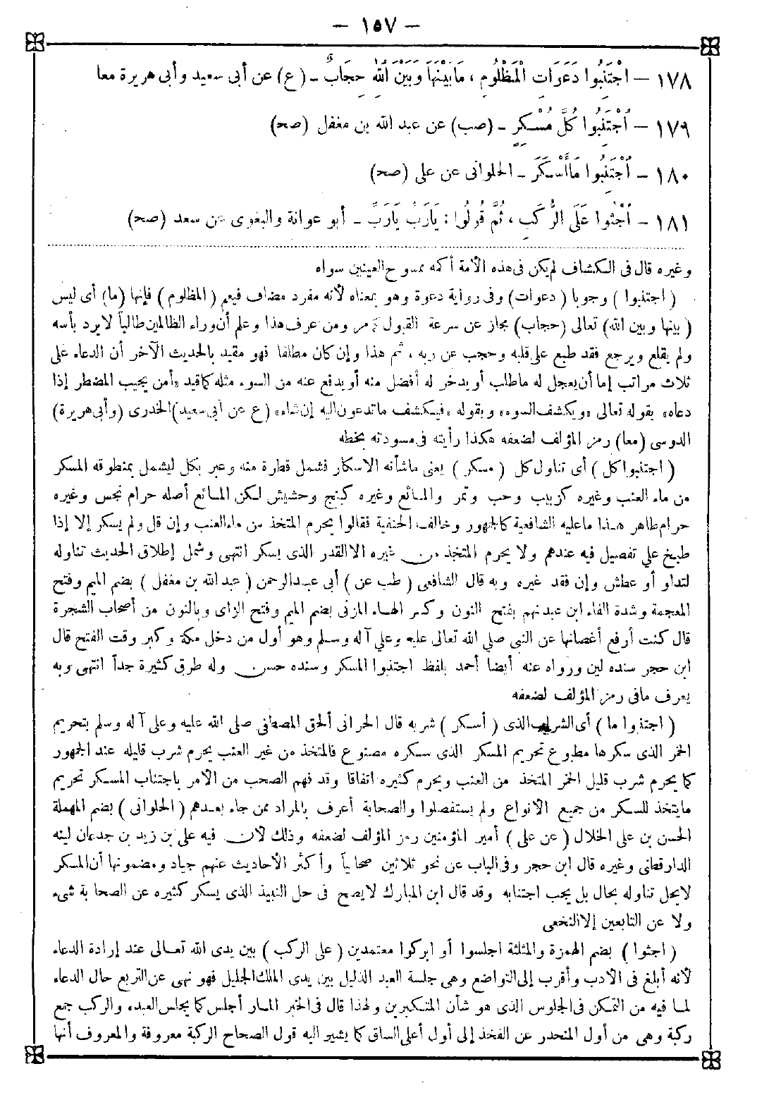 180 - (اجتنبوا ما) أي الشراب الذي (أسكر) شربه قال الحراني: ألحق المصطفى صلى الله عليه وعلى آله وسلم بتحريم الخمر الذي سكرها مطبوع تحريم المسكر الذي سكره مصنوع فالمتخذ من غير العنب يحرم شرب قليله عند الجمهور كما يحرم شرب قليل الخمر المتخذ من العنب ويحرم كثيره اتفاقا وقد فهم الصحب من الأمر باجتناب المسكر تحريم ما يتخذ للسكر من جميع الأنواع ولم يستفصلوا والصحابة أعرف بالمراد ممن جاء بعدهم