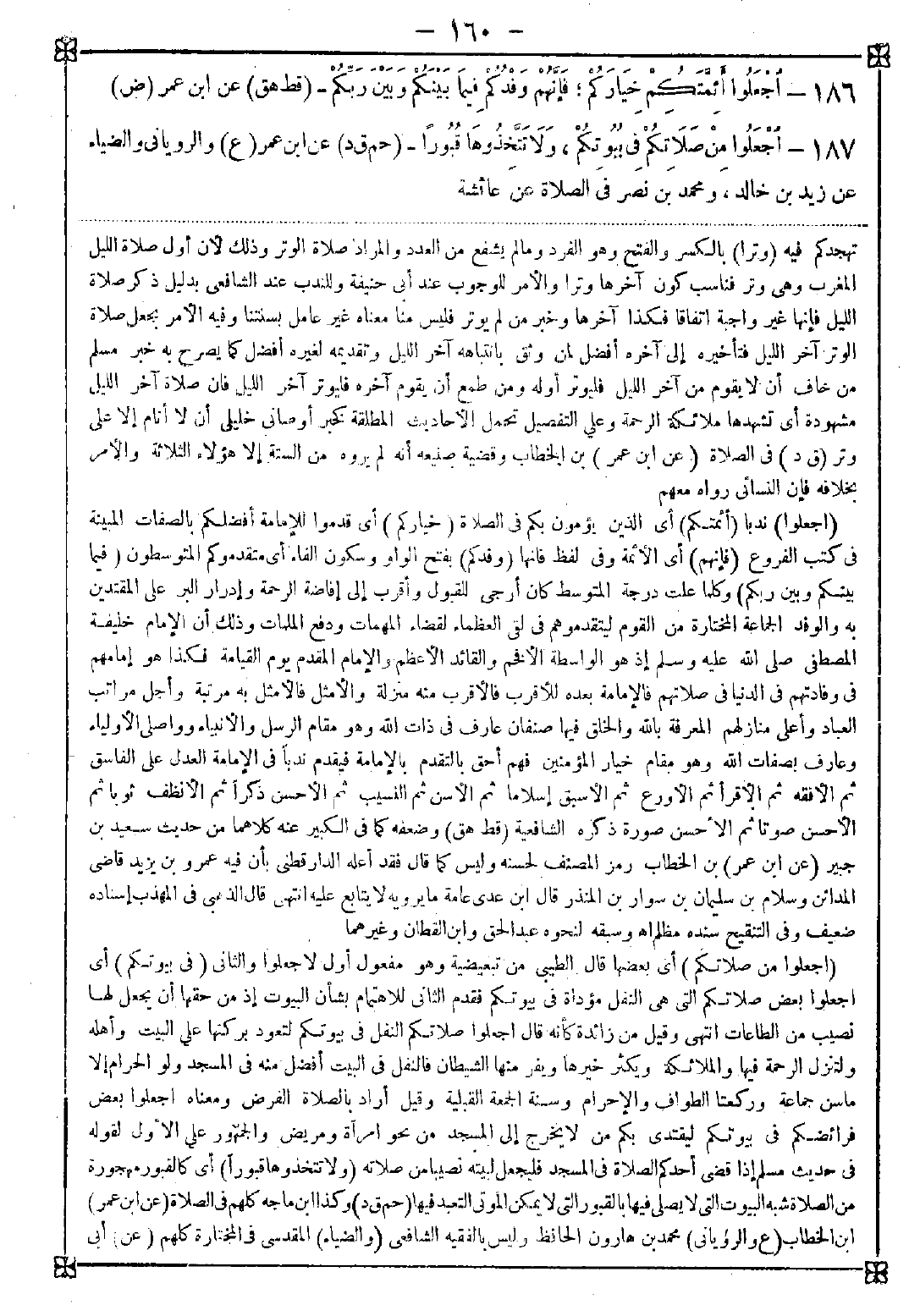 187 - (اجعلوا من صلاتكم) أي بعضها قال الطيبي: من تبعيضية وهو مفعول أول ل اجعلوا والثاني (في بيوتكم) أي اجعلوا بعض صلاتكم التي هي النفل مؤداة في بيوتكم فقدم الثاني للاهتمام بشأن البيوت إذ من حقها أن يجعل لها نصيب من الطاعات انتهى وقيل من زائدة كأنه قال اجعلوا صلاتكم النفل في بيوتكم لتعود بركتها على البيت وأهله ولتنزل الرحمة فيها والملائكة ويكثر خيرها ويفر منها الشيطان فالنفل في البيت أفضل منه في المسجد ولو الحرام إلا ما سن جماعة وركعتا الطواف والإحرام وسنة الجمعة القبلية وقيل أراد بالصلاة الفرض ومعناه اجعلوا بعض فرائضكم في بيوتكم ليقتدى بكم من لا يخرج إلى المسجد من نحو امرأة ومريض والجمهور على الأول لقوله في حديث مسلم إذا قضى أحدكم الصلاة في المسجد فليجعل لبيته نصيبا من صلاته (ولا تتخذوها قبورا) أي كالبور مهجورة من الصلاة شبه البيوت التي لا يصلى فيها بالقبور التي لا يمكن الموتى التعبد فيها