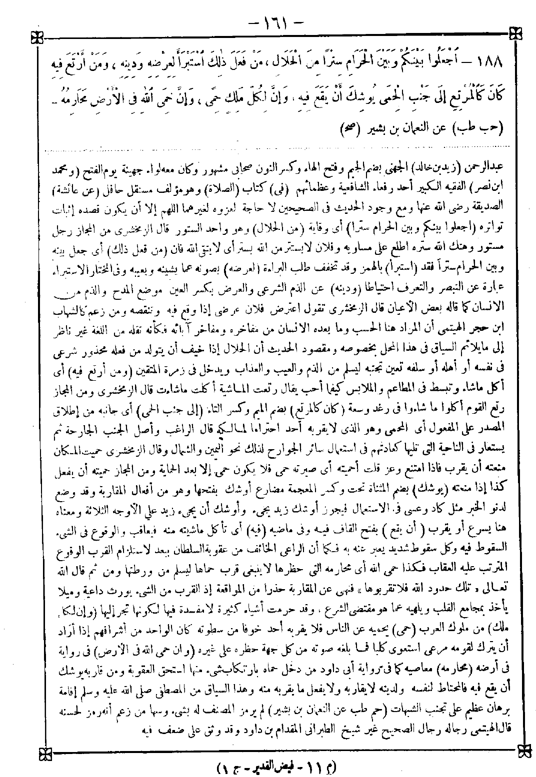 188 - (اجعلوا بينكم وبين الحرام سترا) أي وقاية (من الحلال) وهو واحد الستور قال الزمخشري: من المجاز رجل مستور وهتك الله ستره اطلع على مساويه وفلان لا يستتر من الله بستر أي لا يتقي الله فإن (من فعل ذلك) أي جعل بينه وبين الحرام سترا فقد (استبرأ) بالهمز وقد تخفف طلب البراءة (لعرضه) بصونه عما يشينه ويعيبه وفي المختار الاستبراء عبارة عن التبصر والتعرف احتياطا (ودينه) عن الذم الشرعي والعرض بكسر العين موضع المدح والذم من الإنسان كما قاله بعض الأعيان قال الزمخشري: تقول اعترض فلان عرضي إذا وقع فيه وتنقصه ومن زعم كالشهاب ابن حجر الهيتمي أن المراد هنا الحسب وما يعده الإنسان من مفاخره ومفاخر آبائه فكأنه نقله من لغة غير ناظر إلى ما يلائم السياق في هذا المحل بخصوصه ومقصود الحديث أن الحلال إذا خيف أن يتولد من فعله خور شرعي في نفسه أو أهله أو سلفه تعين تجنبه ليسلم من الذم والعيب والعذاب ويدخل في زمرة المتقين (ومن أرتع فيه) أي أكل ما شاء وتبسط في المطاعم والملابس كيفما أحب يقال رتعت الماشية أكلت ما شاءت قال الزمخشري: من المجاز رتع القوم أكلوا ما شاءوا في رغد وسعة (كان كالمرتع) بضم الميم وكسر التاء (إلى جنب الحمى) أي جانبه من إطلاق المصدر على المفعول أي المحمي وهو الذي لا يقربه أحد احتراما لمالكه. قال الراغب: وأصل الجنب الجارحة ثم يستعار في الناحية التي تليها كعادتهم في استعمال سائر الجوارح لذلك نحو اليمين والشمال. وقال الزمخشري: حميت المكان منعته أن يقرب فإذا امتنع وعز قلت أحميته أي صيرته حمى فلا يكون حمىإلا بعد الحماية ومن المجاز حميته أن يفعل كذا إذا منعته (يوشك) بضم المثناة تحت وكسر المعجمة مضارع أوشك بفتحها وهو من أفعال المقاربة وقد وضع لدنو الخبر مثل كاد وعسى في الاستعمال فيجوز أوشك زيد يجيء وأوشك أن يجيء زيد على الأوجه الثلاثة معناه هنا يسرع أو يقرب (أن يقع) بفتح القاف فيه وفي ماضيه (فيه) أي تأكل ماشيته منه فيعاقب والوقوع في شيء السقوط فيه وكل سقوط شديد يعبر عنه به فكما أن الراعي الخائف من عقوبة السلطان يبعد لاستلزام القرب الوقوع المترتب عليه العقاب فكذا حمى الله أي محارمه التي حظرها لا ينبغي قرب حماها ليسلم من ورطتها ومن ثم قال الله تعالى {تلك حدود الله فلا تقربوها} فنهى عن المقاربة حذرا من المواقعة إذ القرب من الشيء يورث داعية وميلا يأخذ بمجامع القلب ويلهيه عما هو مقتضى الشرع وقد حرمت أشياء كثيرة لا مفسدة فيها لكونها تجر إليها (وإن لكل ملك) من ملوك العرب (حمى) يحميه عن الناس فلا يقربه أحد خوفا من سطوته كان الواحد من أشرفهم إذا أراد أن يترك لقومه مرعى استعوى كلبا فما بلغه صوته من كل جهة حظره على غيره (وإن حمى الله في الأرض) في رواية في أرضه (محارمه) معاصيه كما في رواية أبي داود من دخل حماه بارتكاب شيء منها استحق العقوبة ومن قارب يوشك أن يقع فيه فالمحتاط لنفسه ولدينه لا يقاربه ولا يفعل ما يقربه منه وهذا السياق من المصطفى صلى الله عليه وسلم إقامة برهان عظيم على تجنب الشبهات