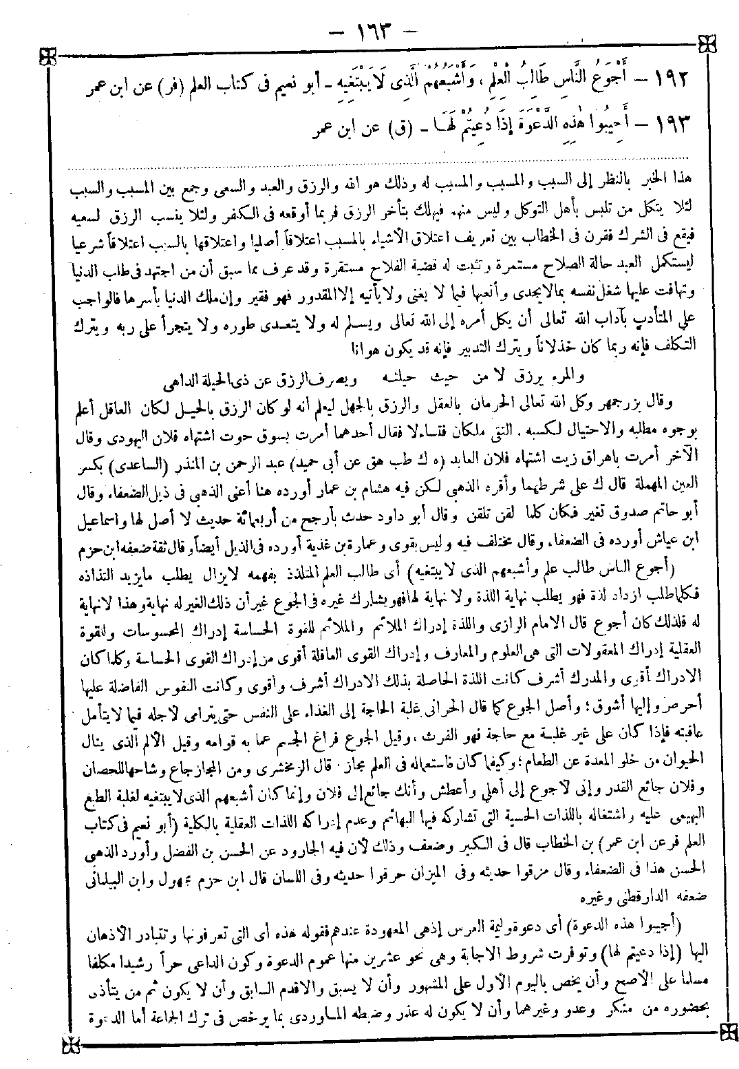 192 - (أجوع الناس طالب علم وأشبعهم الذي لا يبتغيه) أي طالب العلم المتلذذ بفهمه لا يزال يطلب ما يزيد التذاذه فكلما طلب ازداد لذة فهو يطلب نهاية اللذة ولا نهاية لها فهو يشارك غيره في الجوع غير أن ذلك الغير له نهاية وهذا لا نهاية له فلذلك كان أجوع. قال الامام الرازي: واللذة إدراك الملائم والملائم للقوة الحساسة إدراك المحسوسات والقوة العقلية إدراك المعقولات التي هي العلوم والمعارف وإدراك القوى العاقلة أقوى من إدراك القوى الحساسة وكلما كان الإدراك أقوى والمدرك أشرف كانت اللذة الحاصلة بذلك الإدراك أشرف وأقوى وكانت النفوس الفاضلة عليها أحرص وإليها أشوق وأصل الجوع كما قال الحراني غلبة الحاجة إلى الغذاء على النفس حتى يترامى لأجله فيما لا يتأمل عاقبته فإذا كان على غير غلبة مع حاجة فهو الفرث وقيل الجوع فراغ الجسم عما به قوامه وقيل الألم الذي ينال الحيوان من خلو المعدة عن الطعام وكيفما كان فاستعماله في العلم مجاز. قال الزمخشري: ومن المجاز جاع وشاحها للحصان وفلان جائع القدر وإني لأجوع إلى أهلي وأعطش وأنك جائع إلى فلان وإنما كان أشبعهم الذي لا يبتغيه لغلبة الطبع البهيمي عليه واشتغاله باللذات الحسية التي تشاركه فيها البهائم وعدم إدراكه اللذات العقلية بالكلية