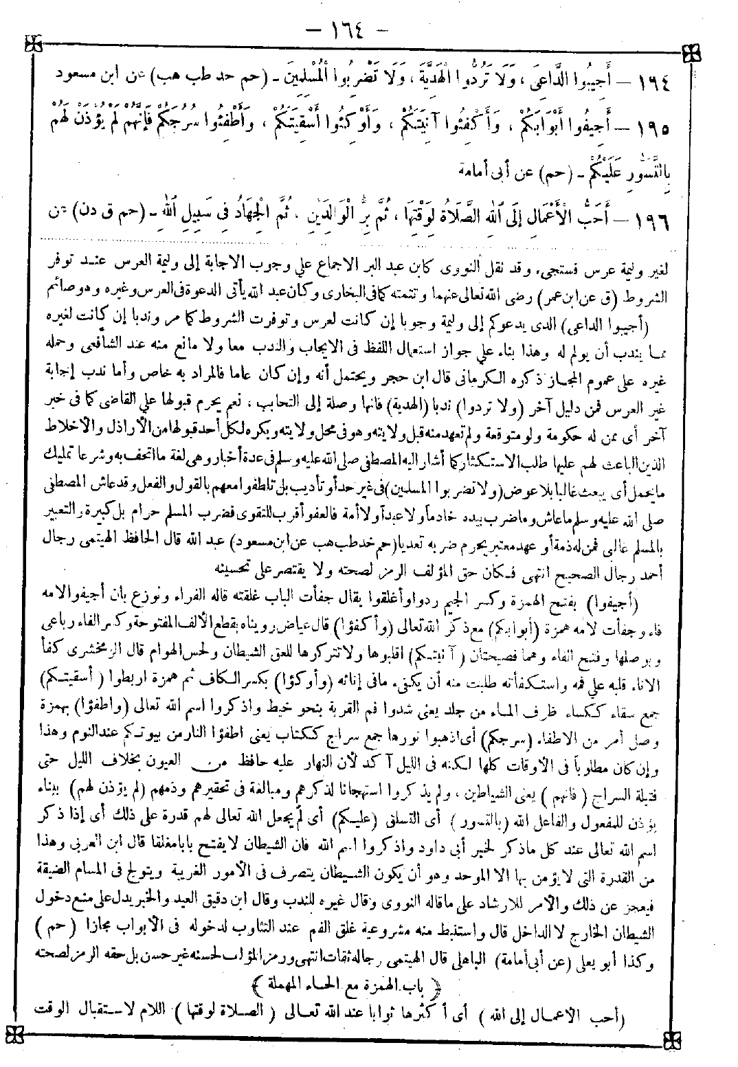 194 - (أجيبوا الداعي) الذي يدعوكم إلى وليمة وجوبا إن كانت لعرس وتوفرت الشروط كما مر وندبا إن كانت لغيره مما يندب أن يولم له وهذا بناء على جواز استعمال اللفظ في الإيجاب والندب معا ولا مانع منه عند الشافعي وحمله غيره على عموم المجاز ذكره الكرماني. قال ابن حجر: ويحتمل أنه وإن كان عاما فالمراد به خاص وأما ندب إجابة غير العرس فمن دليل آخر (ولا تردوا) ندبا (الهدية) فإنها وصلة إلى التحابب نعم يحرم قبولها على القاضي كما في خبر آخر أي ممن له حكومة ولو متوقعة ولم تعهد منه قبل ولايته وهو في محل ولايته ويكره لكل أحد قبولها من الأراذل والأخلاط الذين الباعث لهم عليها طلب الاستكثار كما أشار إليه المصطفى صلى الله عليه وسلم في عدة أخبار وهي لغة ما أتحف به وشرعا تمليك ما يحمل أي يبعث غالبا بلا عوض (ولا تضربوا المسلمين) في غير حد أو تأديب بل تلطفوا معهم بالقول والفعل وقد عاش المصطفى صلى الله عليه وسلم ما عاش وما ضرب بيده خادما ولا عبدا ولا أمة فالعفو أقرب للتقوى فضرب المسلم حرام بل كبيرة والتعبير بالمسلم غالبي فمن له ذمة أو عهد معتبر يحرم ضربه تعديا