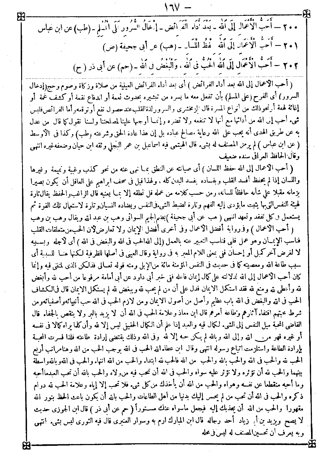 202 - (أحب الأعمال) وفي رواية أفضل الأعمال وفي أخرى أفضل الإيمان ولا تعارض لأن الحب من متعلقات القلب فناسب الإيمان وهو عمل قلبي فناسب التعبير عنه بالعمل (إلى الله الحب في الله والبغض في الله) أي لأجله وبسببه لا لغرض آخر كميل أو إحسان ففي بمعنى اللام المعبر به في رواية. وقال العيني: في أصلها للظرفية لكنها هنا للسببية أي سبب طاعة الله ومعصيته كما في حديث في النفس المؤمنة مئة من الإبل ومنه قوله تعالى {فذلكن الذي لمتنني فيه} وإنما كان أحب الأعمال إلى الله لدلالته على كمال إيمان فاعله ففي خبر أبي داود عن أبي أمامة مرفوعا من أحب لله وأبغض لله وأعطى لله ومنع لله فقد استكمل الإيمان فدل على أن من لم يحب لله ويبغض لله لم يستكمل الإيمان قال في الكشاف الحب في الله والبغض في الله باب عظيم وأصل من أصول الإيمان ومن لازم الحب في الله حب أنبيائه وأصفيائه ومن شرط محبتهم اقتفاء آثارهم وطاعة أمرهم قال ابن معاذ: وعلامة الحب في الله أن لا يزيد بالبر ولا ينقص بالجفاء قال القاضي: المحبة ميل النفس إلى الشيء لكمال فيه والعبد إذا علم أن الكمال الحقيقي ليس إلا لله وأن كلما يراه كمالا في نفسه أو غيره فهو من الله وإلى الله وبالله لم يكن حبه إلا لله وفي الله وذلك يقتضي إرادة طاعته فلذا فسرت المحبة بإرادة الطاعة واستلزمت اتباع رسوله انتهى. وقال ابن عطاء الله: الحب في الله يوجب الحب من الله وهنا مراتب أربع الحب لله والحب في الله والحب بالله والحب من الله فالحب لله ابتداء والحب من الله انتهاء والحب في الله وبالله واسطة بينهما والحب لله أن تؤثره ولا تؤثر عليه سواه والحب في الله أن تحب فيه من ولاه والحب بالله أن تحب العبد ما أحبه وما أحبه منقطعا عن نفسه وهواه والحب من الله أن يأخذك من كل شيء فلا تحب إلا إياه وعلامة الحب لله دوام ذكره والحب في الله أن تحب من لم يحسن إليك بدنيا من أهل الطاعات والحب بالله أن يكون باعث الحظ بنور الله مقهورا والحب من الله أن يجذبك إليه فيجعل ما سواه عنك مستورا