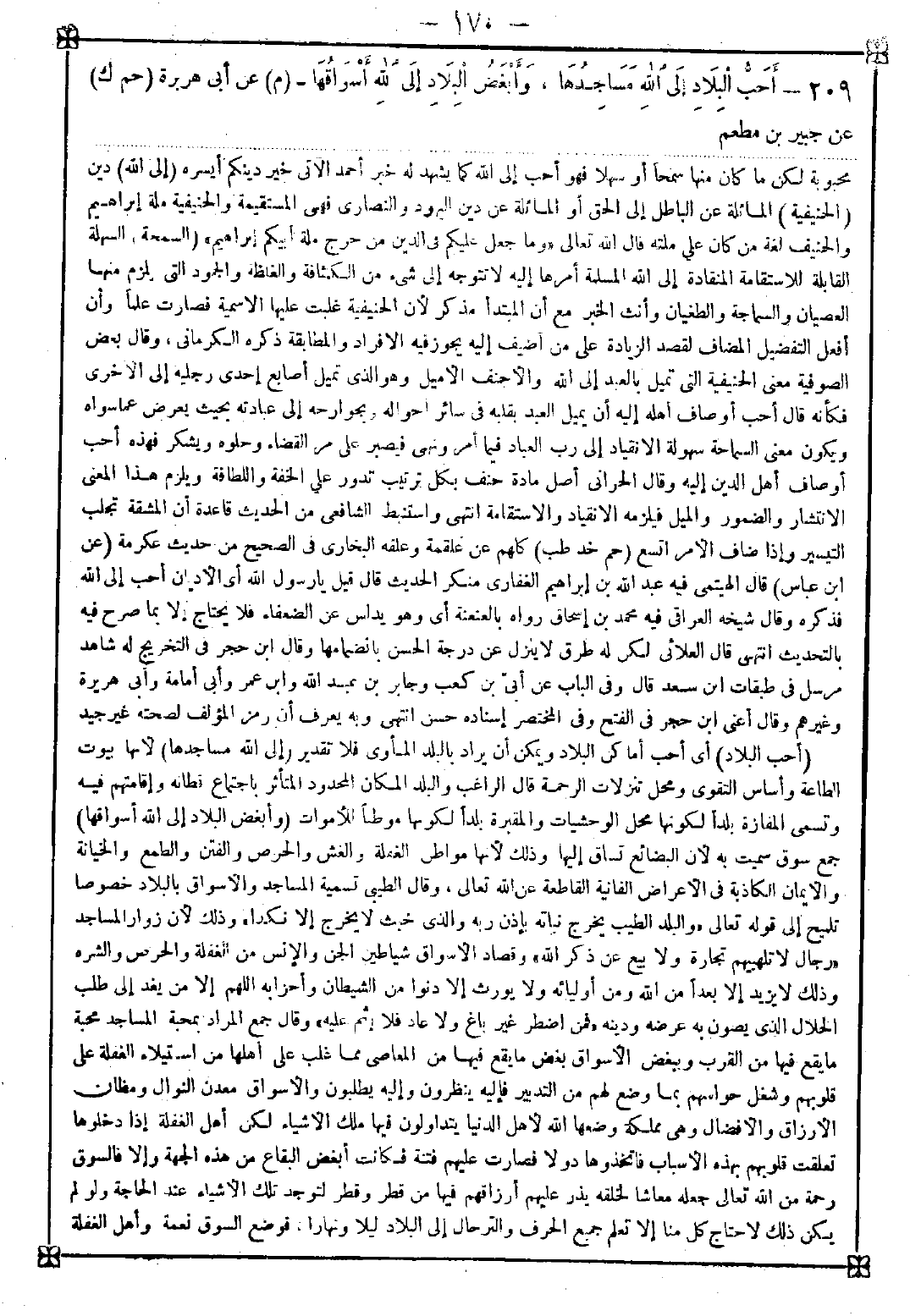 209 - (أحب البلاد) أي أحب أماكن البلاد ويمكن أن يراد بالبلد المأوى فلا تقدير (إلى الله مساجدها) لأنها بيوت الطاعة وأساس التقوى ومحل تنزلات الرحمة. قال الراغب: والبلد المكان المحدود المتأثر باجتماع قطانه وإقامتهم فيه وتسمى المفازة بلدا لكونها محل الوحشيات والمقبرة بلدا لكونها موطنا للأموات (وأبغض البلاد إلى الله أسواقها) جمع سوق سميت به لأن البضائع تساق إليها وذلك لأنها مواطن الغفلة والغش والحرص والفتن والطمع والخيانة والأيمان الكاذبة في الأعراض الفانية القاطعة عن الله تعالى وقال الطيبي: تسمية المساجد والأسواق بالبلاد خصوصا تلميح إلى قوله تعالى {والبلد الطيب يخرج نباته بإذن ربه والذي خبث لا يخرج إلا نكدا} وذلك لأن زوار المساجد {رجال لا تلهيهم تجارة ولا بيع عن ذكر الله} وقصاد الأسواق شياطين الجن والإنس من الغفلة والحرص والشره وذلك لا يزيد إلا بعدا من الله ومن أوليائه ولا يورث إلا دنوا من الشيطان وأحزابه اللهم إلا من يغد إلى طلب الحلال الذي يصون به عرضه ودينه {فمن اضطر غير باغ ولا عاد فلا إثم عليه} وقال جمع: المراد بمحبة المساجد محبة ما يقع فيها من القرب وببغض الأسواق بغض ما يقع فيها من المعاصي مما غلب على أهلها من استيلاء الغفلة على قلوبهم وشغل حواسهم بما وضع لهم من التدبير فإليه ينظرون وإليه يطلبون والأسواق معدن النوال ومظان الأرزاق والأفضال وهي مملكة وضعها الله لأهل الدنيا يتداولون فيها ملك الأشياء لكن أهل الغفلة إذا دخلوها تعلقت قلوبهم بهذه الأسباب فاتخذوها دولا فصارت عليهم فتنة فكانت أبغض البقاع من هذه الجهة وإلا فالسوق رجمة من الله تعالى جعله معاشا لخلقه يذر عليهم أرزاقهم فيها من قطر وقطر لتوجد تلك الأشياء عند الحاجة ولو لم يكن ذلك لاحتاج كل منا إلى تعلم جميع الحرف والترحال إلى البلاد ليلا ونهارا. فوضع السوق نعمة وأهل الغفلة -[171]- صدوا عن هذه الرحمة ودنسوا نفوسهم بتعاطي الخطايا فيه فصارت عليهم نقمة وأما أهل اليقين فهم وإن دخلوها قلوبهم متعلقة بتدبير الله فسلموا من فتنها ومن ثم كان المصطفى صلى الله عليه وسلم يدخل السوق ويشتري ويبيع. قال الطيبي: وإنما قرن المساجد بالأسواق مع وجود ما هو شر منها من البقاع ليقابل بين معنى الالتهاء والاشتغال وأن الأمر الديني يدفعه الأمر الدنيوي