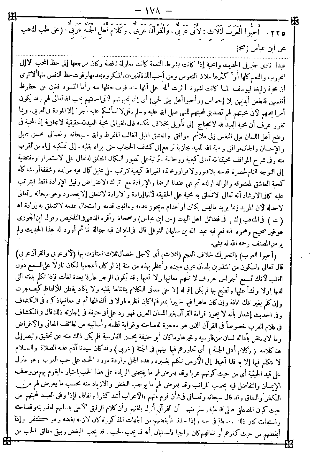 225 - (أحبوا العرب) بالتحريك خلاف العجم (لثلاث) أي لأجل خصال ثلاث امتازت بها (لأني عربي والقرآن عربي) قال تعالى {لتكون من المنذرين بلسان عربي مبين} وأعظم بهذه من منة إذ لو كان أعجميا لكان نازلا على السمع دون القلب لأنك تسمع أجراس حروف لا تفهم معانيها ولا تعيها وقد يكون الرجل عارفا بعدة لغات فإذا تكلم بلغته التي لقنها أولا ونشأ عليها وتطبع بها لم يكن إقباله إلا على معاني الكلام يتلقاها بقلبه ولا يكاد يفطن للألفاظ كيف جرت وإن كلم بغير تلك اللغة وإن كان ماهرا فيها خبيرا بمعرفتها كان نظره أولا في ألفاظها ثم في معانيها ذكره في الكشاف في كلام العرب خصوصا في القرآن الذي هو معجزة لفصاحته وغرابة نظمه وأساليبه من لطائف المعاني والأغراض وما لا يستقل بأدائه لسان من فارسية وغيرها وما كان أبو حنيفة يحسن الفارسية فلم يكن ذلك منه عن تحقيق وتبصر إلى هنا كلامه (وكلام أهل الجنة) أي تحاورهم فيما بينهم في الجنة (عربي) وقد كان سيدنا آدم عليه الصلاة والسلام لا يتكلم فيها إلا به فلما أهبط إلى الأرض تكلم بغيره وهذه الجمل واردة مورد الحث على حب العرب وهو منزل على قيد الحيثية أي من حيث كونهم عربا وقد يعرض لهم ما يوجب البغض والازياد منه بحسب ما يعرض لهم من الكفر والنفاق وقد قال سبحانه وتعالى في شأن قوم منهم {الأعراب أشد كفرا ونفاقا} فإذا وفق العبد لمحبتهم من حيث كون المصطفى صلى الله عليه وسلم منهم أن القرآن أنزل بلغتهم وأن كلام الرفيق الأعلى بلسانهم لعذوبته وفصاحته واستقامته كان ذلك واسطة في حبه وإذا خذل فأبغضهم من الجهات المذكورة كان لازمه بغضه وهو كفر وإذا أبغضهم من حيث كفرهم أو نفاقهم كان واجبا فاستبان أنه قد يجب الحب وقد يجب البغض ويبقى مطلق الحب من -[179]- الحيثية التي سبق الكلام عليها واعلم أن ستة من الأنبياء صلوات الله وسلامه عليهم من العرب نوح وهود وإسماعيل وصالح وشعيب ومحمد وباقيهم من غيرهم <فائدة> رأيت بخط مغلطاي ذكر ابن ظفر عن معمر عن الزهري أشخصت إلى هشام بن عبد الملك فلما كنت بالبلقاء رأيت حجرا مكتوبا عليه بالعبرانية فأرشدت إلى شيخ يقرؤه فلما قرأه ضحك وقال أمر عجيب مكتوب عليه باسمك اللهم جاء الحق من ربك بلسان عربي مبين لا إله إلا الله محمد رسول الله وكتبه موسى بن عمران بخطه انتهى