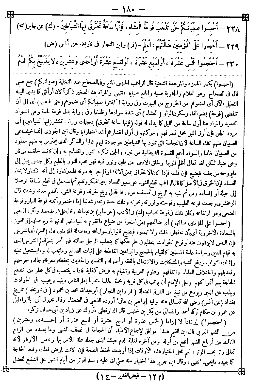 -[180]- 228 - (احبسوا) بكسر الهمزة والموحدة التحتية. قال الراغب: الحبس المنع وفي الصحاح ضد التخلية (صبيانكم) جمع صبي قال في الصحاح وهو الغلام والجارية صبية والجمع صبايا انتهى والمراد هنا الصغير ذكرا كان أو أنثى كما يشير إليه التعليل الآتي أي امنعوهم من الخروج من البيوت وفي رواية اكفتوا صبيانكم أي ضموهم (حتى تذهب) أي إلى أن تنقضي (فوعة) بضم الفاء وسكون الواو (العشاء) أي شدة سوادها وظلمتها وفي رواية بدل فوعة فحمة وهي السواد الشديد والمراد هنا أول ساعة من الليل كما يدل له قوله (فإنها ساعة تخترق) بمعجمات وراء: تنتشر (فيها الشياطين) أي مردة الجن فإن أول الليل محل تصرفهم وحركتهم في أول انتشارهم أشد اضطرابا. وقال ابن الجوزي: إنما خيف على الصبيان منهم تلك الساعة لأن النجاسة التي تلوذ بها الشياطين موجودة فيهم غالبا والذكر الذي يحترس به منهم مفقود من الصبيان غالبا والسواد أجمع للقسوة الشيطانية من غيره والجن تكره النور وتتشاءم به وإن كانت خلقت من نار وهي ضياء لكن الله تعالى أظلم قلوبها وخلق الآدمي من طين ونور قلبه فهو محب للنور بالطبع وكل جنس يميل إلى ما يروحه من جنسه فيضيع فإن قلت فإذا كان الاختراق بمعنى الانتشار فلم عبر به دونه قلت إشارة إلى أنه انتشار لابتغاء الفساد فإن الخرق في الأصل كما قال الراغب قطع الشيء على سبيل الفساد بغير تفكر وتدبر ثم استعمل في قطع المسافة توصلا إلى حيلة أو إفساده ومن ثم شبه به الريح في تعسف مرورها فقيل ريح خرقاء وفوعة الشيء بالضم حدته وشدته قال الزمخشري: وجدت فوعة الطيب وفوحته وفورته وخمرته وذلك حدة ريحه وشدتها إذا اختمر وأتيته فوعة النهار وفوعة الضحى وهو ارتفاعه وكان ذلك في فوعة الشباب