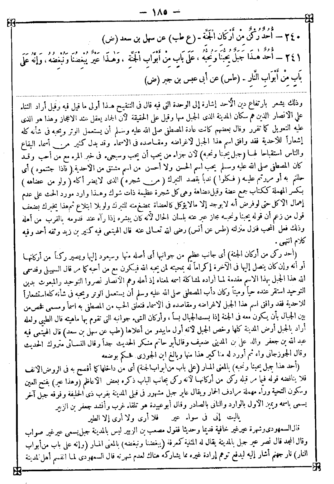 241 - (أحد هذا جبل يحبنا ونحبه) بالمعنى المار (على باب من أبواب الجنة) أي من داخلها كما أفصح به في الروض الأنف فلا يناقضه قوله فيما مر قبله ركن من أركانها لأنه ركن يجانب الباب ذكره بعض الأعاظم (وهذا عير) بفتح العين وسكون التحتية وراء مهملة مرادف الحمار ويقال عاير جبل مشهور في قبلي المدينة بقرب ذي الحليفة وفوقه جبل آخر يسمى باسمه ويميز الأول بالوارد والثاني بالصادر وقال أبو عبيدة هو تلقاء غرب وأنشد جعفر بن الزبير: