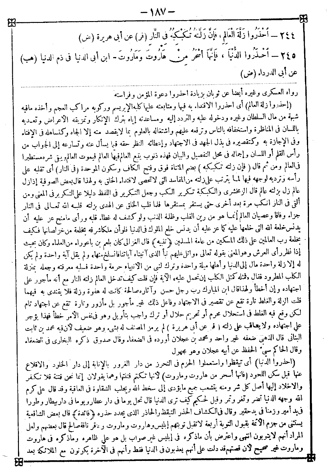 245 - (احذروا الدنيا) أي تيقظوا واستعملوا الحزم في التحرز من دار الغرور بالإنابة إلى دار الخلود والاقلاع عنها قبل سكن اللحود (فإنها أسحر من هاروت ماروت) لأنها تكتم فتنتها وهما يقولان إنما نحن فتنة فلا تكفر والاخلاد إليها أصل كل شر ومنه يتشعب جميع ما يؤدي إلى سخط الله ويجلب الشقاوة في العاقبة وقد قال علي كرم الله وجهه الدنيا تضر وتغر وتمر وقيل لحكيم كيف ترى الدنيا قال تحل يوما في دار عطار ويوما في دار بيطار وطورا في يد أمير وزمنا في يد حقير وقال في الكشاف الحذر التيقظ والحاذر الذي يجدد حذره <فائدة> قال بعض الشافعية يستثنى من جزم الأئمة بقبول التوبة أربعة لا تقبل توبتهم إبليس وهاروت وماروت وعاقر ناقة صالح. قال بعضهم: ولعل المراد أنهم لا يتوبون انتهى واعترض بأن ما ذكره في إبليس غير صواب بل هو على ظاهره وما ذكره في هاروت وماروت غير صحيح لأن قصتهم قد دلت على أنهم يعذبون في الدنيا فقط وأنهم في الآخرة يكونون مع الملائكة بعد -[188]- ردهم إلى صفاتهم