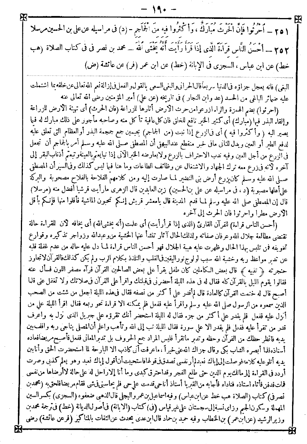 251 - (احرثوا) بضم الهمزة والراء ازرعوا من حرث الأرض أثارها للزراعة (فإن الحرث) أي تهيئة الأرض للزراعة وإلقاء البذر فيها (مبارك) أي كثير الخير نافع للخلق فإن كل عافية تأكل منه وصاحبه مأجور على ذلك مبارك له فيما يصير إليه (وأكثروا فيه) أي في الزرع إذا نبت (من الجماجم) بجيمتين جمع جمجمة البذر أو العظام التي تعلق عليه لدفع الطير أو العين ويدل للثاني ما في خبر منقطع عند البيهقي أن المصطفى صلى الله عليه وسلم أمر بالجماجم أن تجعل في الزرع من أجل العين وفيه ندب الاحتراف بالزرع ولا يعارضه الخبر الآتي إذا تبايعتم بالعينة وتبعتم أذناب البقر إلى آخره لأن في زرع معه ترك الجهاد والاشتغال عن وظائف الطاعات وما هنا فيما ليس كذلك وفي السير أن المصطفى صلى الله عليه وسلم كان يزرع أرض بني النضير لما صارت إليه ومن كلامهم الفلاحة بالفلاح مصحوبة والبركة على أهلها مصبوبة