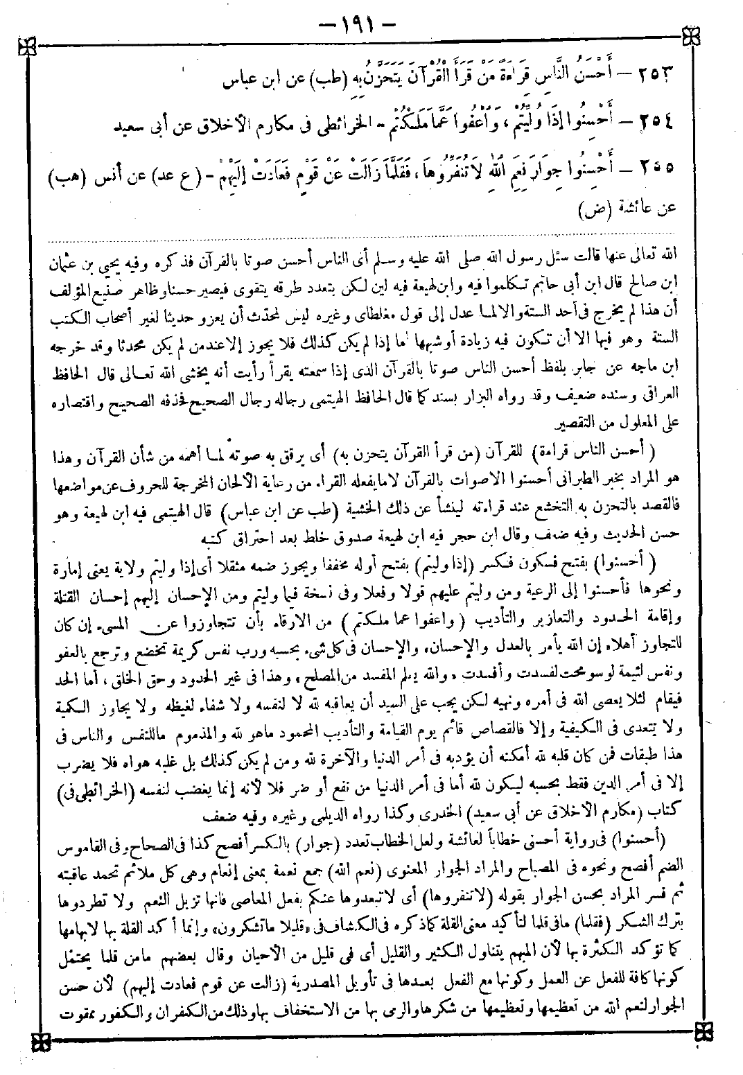 253 - (أحسن الناس قراءة) للقرآن (من قرأ القرآن يتحزن به) أي يرقق به صوته لما أهمه من شأن القرآن وهذا هو المراد بخبر الطبراني أحسنوا الأصوات بالقرآن لا ما يفعله القراء من رعاية الألحان المخرجة للحروف عن مواضعها فالقصد بالتحزن به التخشع عند قراءته لينشأ عن ذلك الخشية