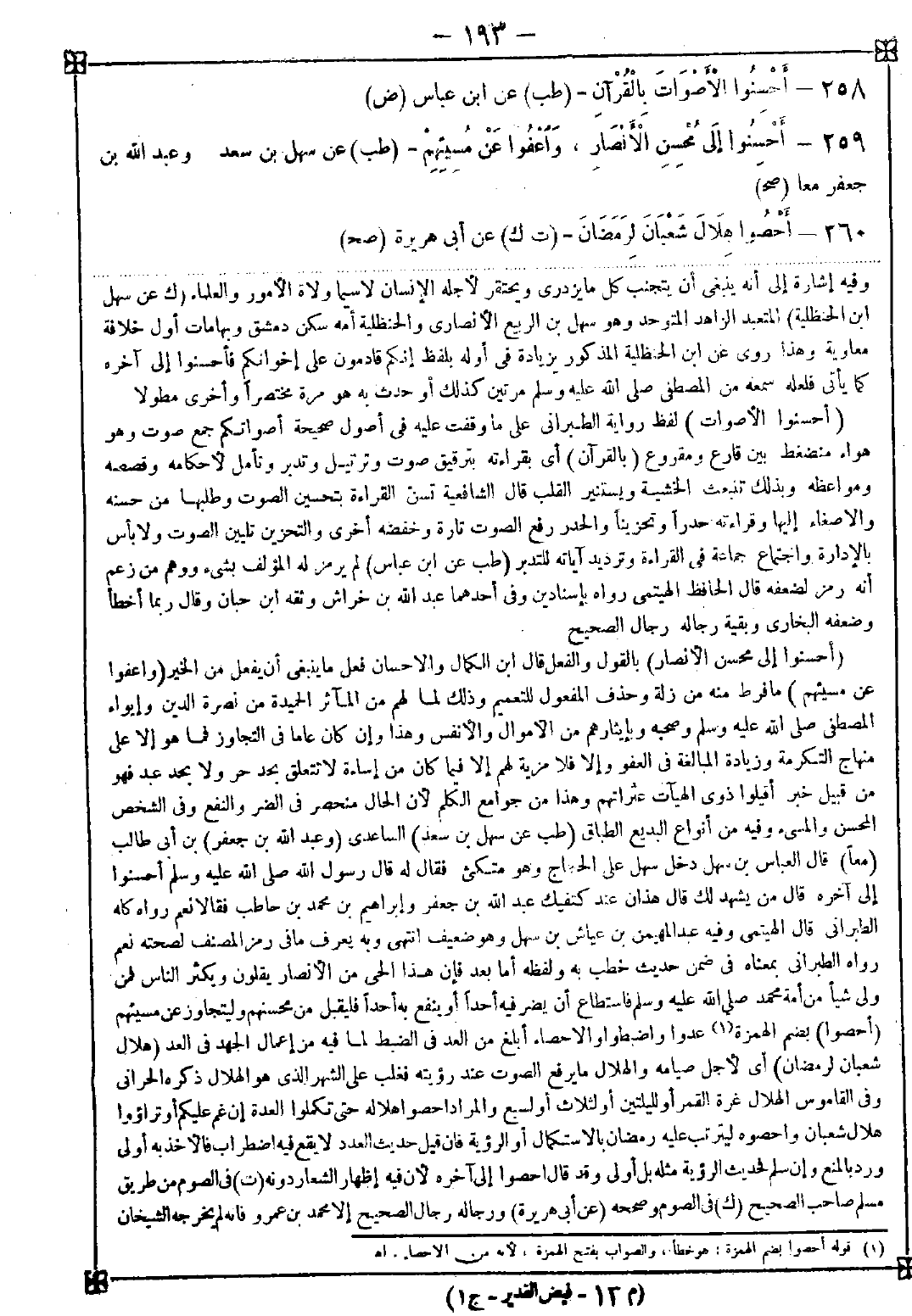 258 - (أحسنوا الأصوات) لفظ رواية الطبراني على ما وقفت عليه في أصول صحيحة أصواتكم جمع صوت وهو هواء منضغط بين قارع ومقروع (بالقرآن) أي بقراءته بترقيق صوت وترتيل وتدبر وتأمل لأحكامه وقصصه ومواعظه وبذلك تنبعث الخشية ويستنير القلب قال الشافعية تسن القراءة بتحسين الصوت وطلبها من حسنه والإصغاء إليها وقراءته حدرا وتحزينا والحدر رفع الصوت تارة وخفضه أخرى والتحزين تليين الصوت ولا بأس بالإدارة واجتماع جماعة في القراءة وترديد آياته للتدبر