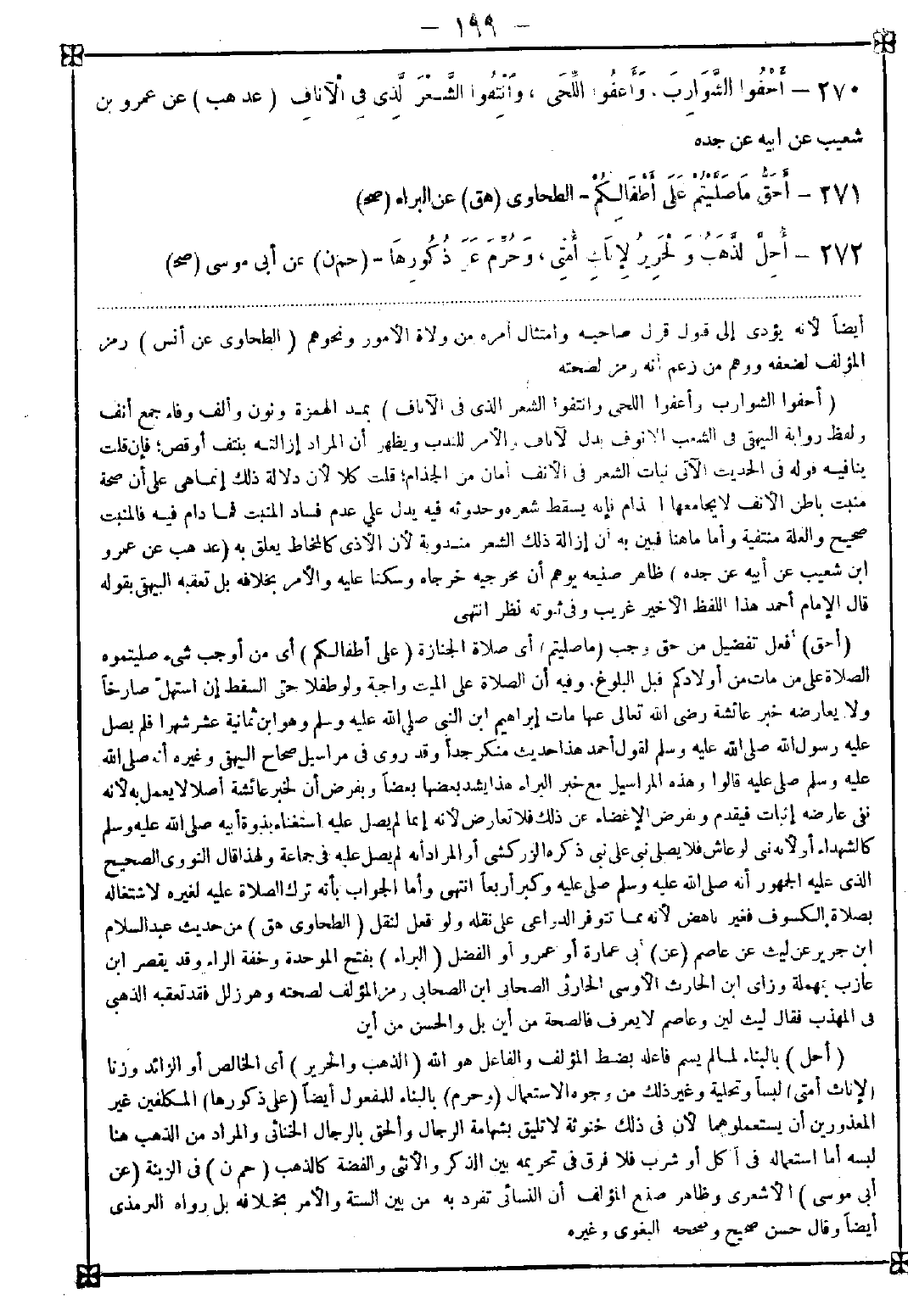 272 - (أحل) بالبناء لما لم يسم فاعله بضبط المؤلف والفاعل هو الله (الذهب والحرير) أي الخالص أو الزائد وزنا (لإناث أمتي) لبسا وتحلية وغير ذلك من وجوه الاستعمال (وحرم) بالبناء للمفعول أيضا (على ذكورها) المكلفين غير المعذورين أن يستعملوهما لأن في ذلك خنوثة لا تليق بشهامة الرجال وألحق بالرجال الخناثى والمراد من الذهب هنا لبسه أما استعماله في أكل أو شرب فلا فرق في تحريمه بين الذكر والأنثى والفضة كالذهب