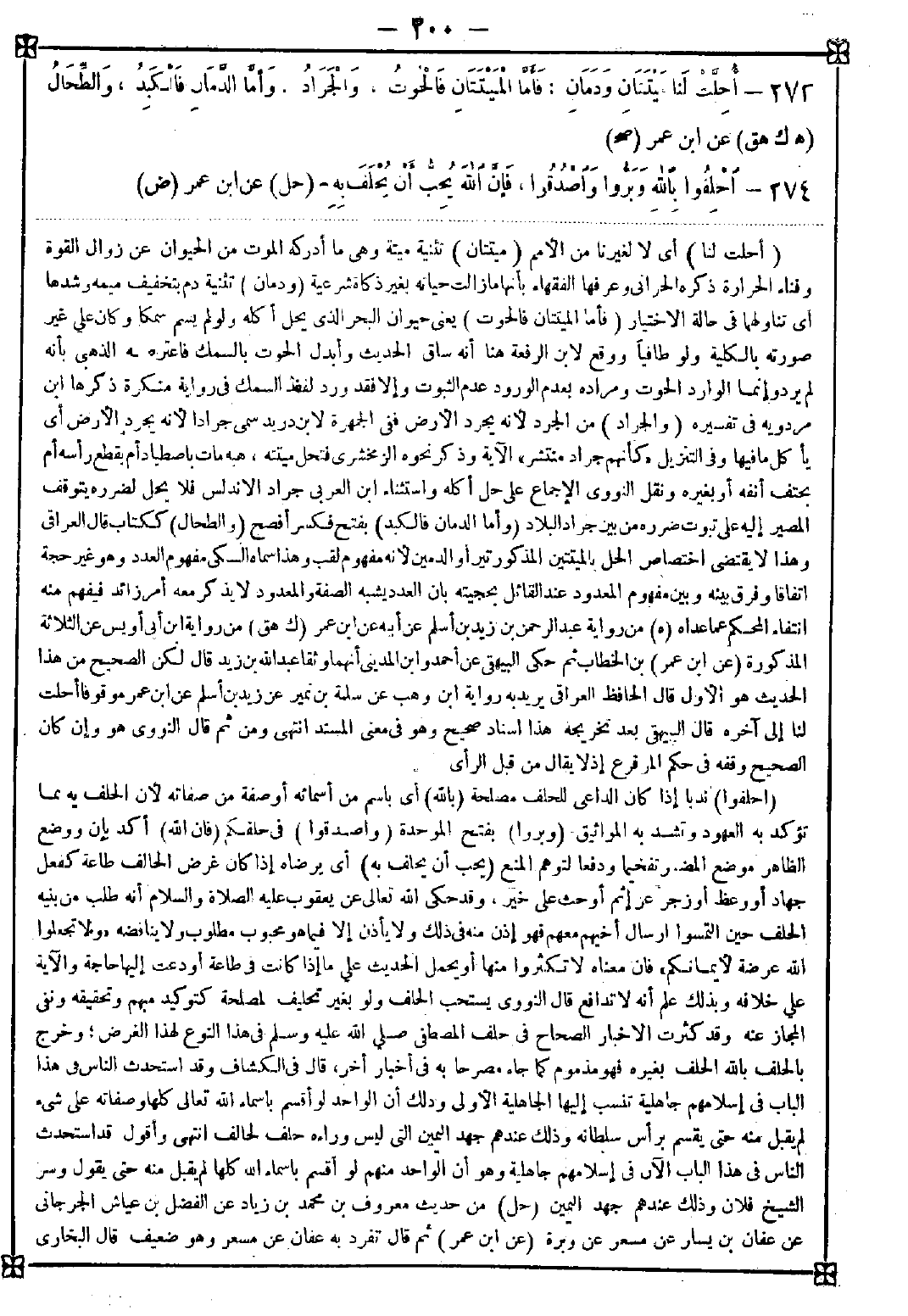 -[200]- 273 - (أحلت لنا) أي لا لغيرنا من الأمم (ميتتان) تثنية ميتة وهي ما أدركه الموت من الحيوان عن زوال القوة وفناء الحرارة ذكره الحراني وعرفها الفقهاء بأنها ما زالت حياته بغير ذكاة شرعية (ودمان) تثنية دم بتخفيف ميمه وشدها أي تناولهما في حالة الاختيار (فأما الميتتان فالحوت) يعني حيوان البحر الذي يحل أكله ولو لم يسم سمكا وكان على غير صورته بالكلية ولو طافيا ورفع لابن الرفعة هنا أنه ساق الحديث وأبدل الحوت بالسمك فاعترضه الذهبي بأنه لم يرد وإنما الوارد الحوت ومراده بعدم الورود عدم الثبوت وإلا فقد ورد لفظ السمك في رواية منكرة ذكرها ابن مردويه في تفسيره (والجراد) من الجرد لأنه يجرد الأرض ففي الجمهرة لابن دريد سمي جرادا لأنه يجرد الأرض أي يأكل ما فيها وفي التنزيل {كأنهم جراد منتشر} الآية وذكر نحوه الزمخشري فتحل ميتته هبه مات باصطياد أم بقطع رأسه أم بحتف أنفه على ثبوت ضرره من بين جراد البلاد (وأما الدمان فالكبد) بفتح فكسر أفصح (والطحال) ككتاب قال العراقي وهذا لا يقتضي اختصاص الحل بالميتتين المذكورتين أو الدمين لأنه مفهوم لقب وهذا سماه السكي مفهوم العدد وهو غير حجة اتفاقا وفرق بينه وبين مفهوم المعدود عند القائل بحجيته بأن العدد يشبه الصفة والمعدود لا يذكر معه أمر زائد فيفهم منه انتفاء المحكم عما عداه