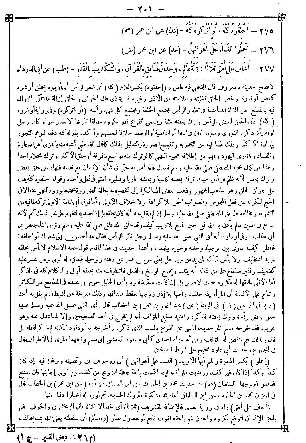 275 - (احلقوه) بكسر اللام (كله) أي شعر الرأس أي أزيلوه بحلق أو غيره كقص أو نورة وخص الحلق لغلبته وسلامته من الأذى وغيره قد يؤذي. قال الحراني: والحلق إزالة ما يتأتى الزوال فيه بالقطع من الآلة الماضية في عمله والرأس مجتمع الخلقة ومجتمع كل شيء رأسه (أو اتركوه) وفي رواية أو ذروه (كله) فإن الحلق لبعض الرأس وترك بعضه مثله ويسمى القزع فهو مكروه مطلقا تنزيها إلا لعذر سواء كان لرجل أو امرأة ذكره النووي وسواء كان في القفا أو الناصية أو الوسيط خلافا لبعضهم وأكده بقوله كله دفعا لتوهم التجوز بإرادة الأكثر وذلك لما فيه من التشويه وتقبيح الصورة والتعليل بذلك كما قال القرطبي أشبه منه بأنه زي أهل الدعارة والفساد وبأنه زي اليهود وفهم من إطلاقه عموم النهي كما لو ترك منه مواضع متفرقة أو حلق الأكثر وترك محلا واحدا وهذا من كمال محبة المصطفى صلى الله عليه وسلم للعدل فإنه أمر به حتى في شأن الإنسان مع نفسه فنهاه عن حلق بعض وترك بعض لأنه ظلم للرأس حيث ترك بعضه كاسيا وبعضه عاريا ونظيره المشي في نعل واحدة وقوله احلقوه كله يدل على جواز الحلق وهو مذهب الجمهور وذهب بعض المالكية إلى تخصيصه بحالة الضرورة محتجا بورود النهي عنه إلا في الحج لكونه من فعل المجوس والصواب الحل بلا كراهة ولا خلاف الأولى وأما قول أي شامة الأولى تركه لما فيه من التشويه ومخالفة طريق المصطفى صلى الله عليه وسلم إذ لم ينقل عنه أنه كان يحلقه بل إذا قصد به التقرب في غير نسك أثم لأنه شرع في الدين ما لم يأذن به الله ففي حيز المنع بلا ريب كيف وقد حلق المصطفى صلى الله عليه وسلم رؤوس أبناء جعفر بن أبي طالب وفي أبي داود أنه أتى النبي صلى الله عليه وسلم رجل ثائر الرأس فقال مه أحسن إلى شعرك أو احلقه فانظر كيف سوى بين ترجيله وحلقه وخيره بينهما؟ وأعدل حديث في هذا المقام قول حجة الاسلام لا بأس بحلقه لمريد التنظيف ولا بأس بتركه لمن يدهن ويترجل يعني من قدر على دهنه وترجيله فبقاؤه له أولى ومن عسر عليه كضعيف وفقير منقطع علم من بقائه أنه يتلبد ويجمع الوسخ والقمل فالتنظيف منه بحلقه أولى والكلام كله في الذكر أما الأنثى فحلقها له مكروه حيث لا ضرر بل إن كانت مفترشة ولم يأذن الحليل حرم بل عده في المطامح من الكبائر وشاع على الألسنة أن المرأة إذا حلقت رأسها بلا إذن زوجها سقط صداقها وذلك صرخة من الشيطان لم يقل به أحد