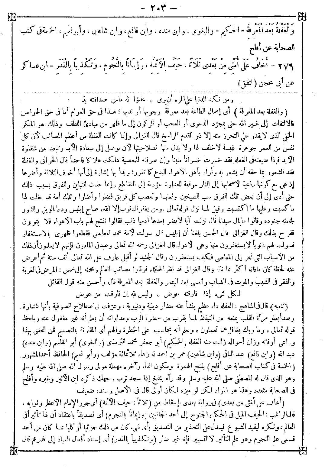 279 - (أخاف على أمتي من بعدي) في رواية بعدي بإسقاط من (ثلاثا: حيف الأئمة) أي جور الإمام الأعظم ونوابه قال الراغب: الحيف الميل في الحكم والجنوح إلى أحد الجانبين (وإيمانا بالنجوم) أي تصديقا باعتقاد أن لها تأثيرا في العالم ونكره ليفيد الشيوع فيدل على التحذير من التصديق بأي شيء كان من ذلك جزئيا أو كليا مما كان من أحد فسمى علم النجوم وهو علم التأثير لا التسيير فإنه غير ضار (وتكذيبا بالقدر) أي إسناد أفعال العباد إلى قدرهم قال -[204]- الغزالي العلم لا يذم لعينه وإنما يذم في حق العباد لأسباب ككونه مضرا بصاحبه أو غيره غالبا كعلم النجوم فإنه غير مذموم لذاته إذ هو قسمان حسابي وقد نطق القرآن العزيز بأن علم تسيير الكواكب محبوب {الشمس والقمر بحسبان} وأحكامي وحاصله يرجع إلى الاستدلال على الحوادث بالأسباب وذلك يضاهي استدلال الطبيب بالنبض على ما يحدث من المرض وهو معرفة مجاري سنة الله تعالى في خلقه لكن ذمه الشرع لإضراره بأكثر الخلق حسما للباب فإنه إذا ألقى إليهم أن هذه الآثار تحدث عند قران الكواكب أو تناظرها أو صعودها أو هبوطها أو غير ذلك وقع في نفوسهم أنها هي المؤثرة وأنها آلهة لكونها جواهر شريفة سماوية يعظم وقعها في القلوب فيبقى القلب ملتفتا إليها ويرى الخير والشر منها وينمحي ذكر الله من قلبه إذ الضعيف يقصر نظره على الوسائط والعالم الراسخ مطلع على أن الشمس والقمر والنجوم مسخرات بأمره وأن أفعالها وتأثيرها بأقداره وبمشيئته لا بقدرها فلا يتزلزل ولا يضطرب بحال وإن شاهد منها عجائب الأحوال