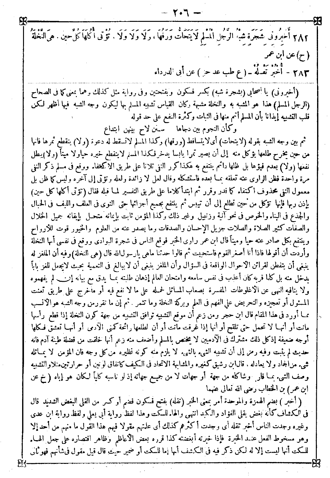 -[206]- 282 - (أخبروني) يا أصحابي (بشجرة شبه) بكسر فسكون وبفتحتين وفي رواية مثل كذلك وهما بمعنى كما في الصحاح (الرجل المسلم) هذا هو المشبه به والنخلة مشبهة وكان القياس تشبيه المسلم بها ليكون وجه الشبه فيها أظهر لكن قلب التشبيه إيذانا بأن المسلم أتم منها في الثبات وكثرة النفع على حد قوله: