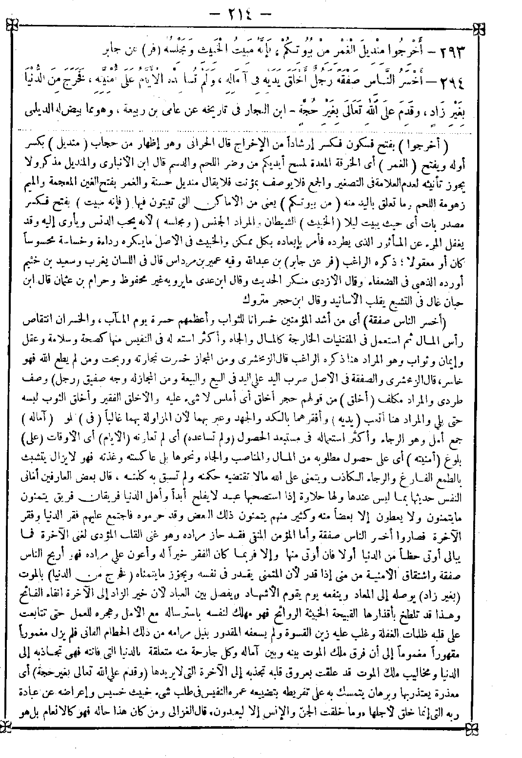 294 - (أخسر الناس صفقة) أي من أشد المؤمنين خسرانا للثواب وأعظمهم حسرة يوم المآب والخسران انتقاص رأس المال ثم استعمل في المقتنيات الخارجة كالمال والجاه وأكثر استعماله في النفيس منها كصحة وسلامة وعقل وإيمان وثواب وهو المراد هنا ذكره الراغب. قال الزمخشري: ومن المجاز خسرت تجارته وربحت ومن لم يطع الله فهو خاسر قال الزمخشري: والصفقة في الأصل ضرب اليد على اليد في البيع والبيعة ومن المجاز له وجه صفيق (رجل) وصف طردي والمراد مكلف (أخلق) من قولهم حجر أخلق أي أملس لا شيء عليه والأخلق الفقير وأخلق الثوب لبسه حتى بلي والمراد هنا أتعب (يديه) وأفقرهما بالكد والجهد وعبر بهما لأن المزاولة بهما غالبا (في) لو (آماله) جمع أمل وهو الرجاء وأكثر استعماله في مستبعد الحصول (ولم تساعده) أي لم تعاونه (الأيام) أي الأوقات (على) بلوغ (أمنيته) أي حصول مطلوبه من المال والمناصب والجاه ونحوها بل عاكسته وغذته فهو لا يزال يتشبث بالطمع الفارغ والرجاء الكاذب ويتمنى على الله ما لا تقتضيه حكمته ولم تسبق به كلمته قال بعض العارفين: أماني النفس حديثها بما ليس عندها ولها حلاوة إذا استصحبها عبد لا يفلح أبدا وأهل الدنيا فريقان فريق يتمنون ما يتمنون ولا يعطون إلا بعضا منه وكثير منهم يتمنون ذلك البعض وقد حرموه فاجتمع عليهم فقر الدنيا وفقر الآخرة فصاروا أخسر الناس صفقة وأما المؤمن المتقي فقد حاز مراده وهو غني القلب المؤدي لغنى الآخرة فما يبالي أوتي حظا من الدنيا أو لا فإن أوتي منها وإلا فربما كان الفقر خيرا له وأعون على مراده فهو أربح الناس صفقة واشتقاق الأمنية من مني إذا قدر لأن التمني يقدر في نفسه ويجوز ما يتمناه (فخرج من الدنيا) بالموت (بغير زاد) يوصله إلى المعاد وينفعه يوم يقوم الأشهاد ويفصل بين العباد لأن خير الزاد إلى الآخرة إتقاء القبائح وهذا قد تلطخ بأقذارها القبيحة الخبيثة الروائح فهو مهلك لنفسه باسترساله مع الأمل وهجره للعمل حتى تتابعت على قلبه ظلمات الغفلة وغلب عليه زين القسوة ولم يسعفه المقدور بنيل مرامه من ذلك الحطام الفاني فلم يزل مغمورا مقهورا مغموما إلى أن فرق ملك الموت بينه وبين آماله وكل جارحة منه متعلقة بالدنيا التي فاتته فهي تجاذبه إلى الدنيا ومخاليب ملك الموت قد علقت بعروق قلبه تجذبه إلى الآخرة التي لا يريدها (وقدم على الله تعالى بغير حجة) أي معذرة يعتذرها وبرهان يتمسك به على تفريطه بتضييعه عمره النفيس في طلب شيء خبيث خسيس وإعراضه عن عبادة ربه التي إنما خلق لأجلها {وما خلقت الجن والإنس إلا ليعبدون} قال الغزالي ومن كان هذا حاله فهو كالأنعام بل هو -[215]- أضل إذ البهيمة لم تخلق لها المعرفة والقدرة التي بها تجاهد الشهوات وهذا قد خلق له وعطله فهو الناقص عقلا المدبر يقينا وقيل في المعنى: