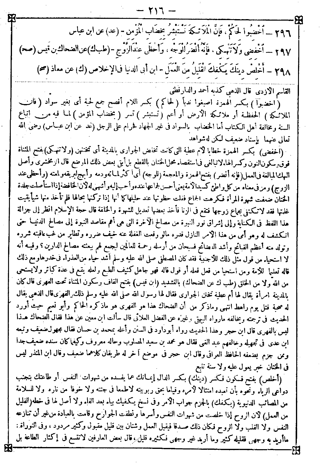 296 - (اخضبوا) بكسر الهمزة اصبغوا ندبا (لحاكم) بكسر اللام أفصح جمع لحية أي بغير سواد (فإن الملائكة) الحفظة أو ملائكة الأرض أو أعم (تستبشر) تسر (بخضاب المؤمن) لما فيه من اتباع السنة ومخالفة أهل الكتاب أما الخضاب بالسواد في غير الجهاد فحرام على الرجل