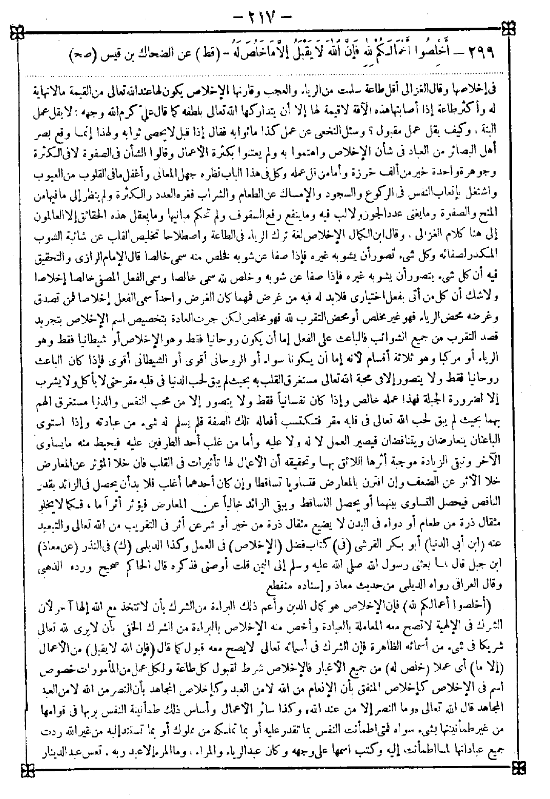 299 - (أخلصوا أعمالكم لله) فإن الإخلاص هو كمال الدين وأعم ذلك البراءة من الشرك بأن لا تتخذ مع الله إلها آخر لأن الشرك في الإلهية لا تصح معه المعاملة بالعبادة وأخص منه الإخلاص بالبراءة من الشرك الخفي بأن لا يرى لله تعالى شريكا في شيء من أسمائه الظاهرة فإن الشرك في أسمائه تعالى لا يصح معه قبول كما قال (فإن الله لا يقبل) من الأعمال (إلا ما) أي عملا (خلص له) من جميع الأغيار فالإخلاص شرط لقبول كل طاعة ولكل عمل من المأمورات خصوص اسم في الإخلاص كإخلاص المنفق بأن الإنعام من الله لا من العبد وكإخلاص المجاهد بأن النصر من الله لا من العبد المجاهد قال الله تعالى {وما النصر إلا من عند الله} وكذا سائر الأعمال. وأساس ذلك طمأنينة النفس بربها في قوامها من غير طمأنينتها بشيء سواه فمتى اطمأنت النفس بما تقدر عليه أو بما تملكه من مملوك أو بما تستند إليه من غير الله ردت جميع عبادتها لما اطمأنت إليه وكتب اسمها على وجهه وكان عبد الرياء والمراء وما المرء إلا عبد ربه تعس عبد الدينار -[218]- والدرهم والخميصة وهذا هو الذي أحبط عمل العاملين من حيث لا يشعرون {إنا لله وإنا إليه راجعون} قال الإمام الغزالي: سبيل النجاة أن تخلص عملك وتجرد إرادتك لله والقلوب والنواصي بيده سبحانه وتعالى فهو يميل إليك القلوب ويجمع لك النفوس ويشحن من حبك الصدور فتنال من ذلك ما لا تناله بجهدك وقصدك وإن لم تفعل وقصدت رضا المخلوق دونه صرف عنك القلوب ونفر منك النفوس وأسخط عليك الخلق فتكون من الخاسرين