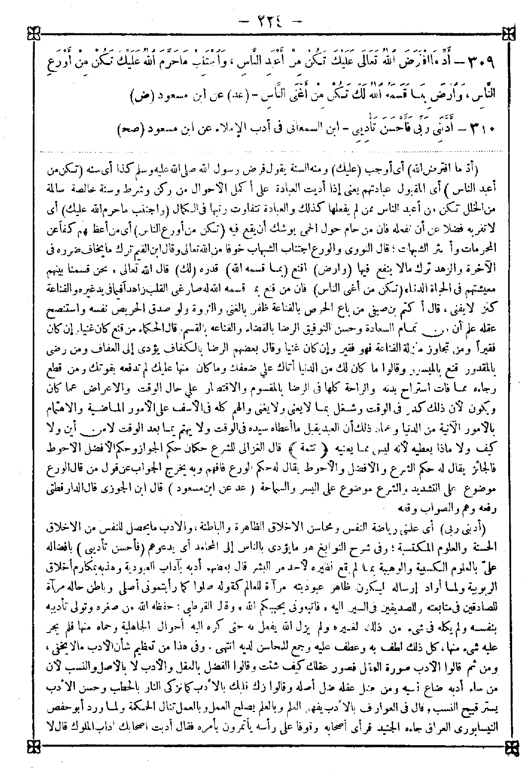 -[224]- 309 - (أد ما افترض الله) أي أوجب (عليك) ومنه السنة يقول فرض رسول الله صلى الله عليه وسلم كذا أي سنه (تكن من أعبد الناس) أي المقبول عبادتهم يعني إذا أديت العبادة على أكمل الأحوال من ركن وشرط وسنة خالصة سالمة من الخلل تكن من أعبد الناس ممن لم يفعلها كذلك والعبادة تتفاوت رتبها في الكمال (واجتنب ما حرم الله عليك) أي لا تقربه فضلا عن أن نفعله فإن من حام حول الحمى أوشك أن يقع فيها (تكن من أورع الناس) أي من أعظمهم كفا عن المحرمات وأكثر الشبهات قال النووي: والورع اجتناب الشبهات خوفا من الله تعالى وقال ابن القيم: ترك ما يخاف ضرره في الآخرة والزهد ترك ما لا ينفع فيها (وارض) اقنع (بما قسمه الله) قدره (لك) قال الله تعالى {نحن قسمنا بينهم معيشتهم في الحياة الدنيا} (تكن من أغنى الناس) فإن من قنع بما قسمه الله له صار غني القلب زاهدا فيما في يد غيره والقناعة كنز لا يفنى قال أكتم بن صيفي: من باع الحرص بالقناعة ظفر بالغنى والثروة ولو صدق الحريص نفسه واستنصح عقله علم أن من تمام السعادة وحسن التوفيق الرضا بالقضاء والقناعة بالقسم قال الحكماء: من قنع كان غنيا وإن كان فقيرا ومن تجاوز ما له من القناعة فهو فقير وإن كان غنيا وقال بعضهم: الرضا بالكفاف يؤدي إلى العفاف ومن رضي بالمقدور قنع بالميسور وقالوا: ما كان لك من الدنيا أتاك على ضعفك وما كان منها عليك لم تدفعه بقوتك ومن قطع رجاءه مما فات استراح بدنه والراحة كلها في الرضا بالمقسوم والاقتصار على حال الوقت والإعراض عما كان ويكون لأن ذلك كدر في الوقت وشغل بما لا يعني ولا يغني والهم كله في الأسف على الأمور الماضية والاهتمام بالأمور الآتية من الدنيا وعماد ذلك أن العبد يقبل ما أعطاه سيده في الوقت ولا يهتم بما بعد الوقت لا من أين ولا كيف ولا ماذا يعطيه لأنه ليس مما يعنيه (تتمة) قال الغزالي: للشرع حكمان حكم الجواز وحكم الأفضل الأحوط فالجائز يقال له حكم الشرع والأفضل والأحوط يقال له حكم الورع فافهم وبه يخرج الجواب عن قول من قال الورع موضوع على التشديد والشرع موضوع على اليسر والسماحة