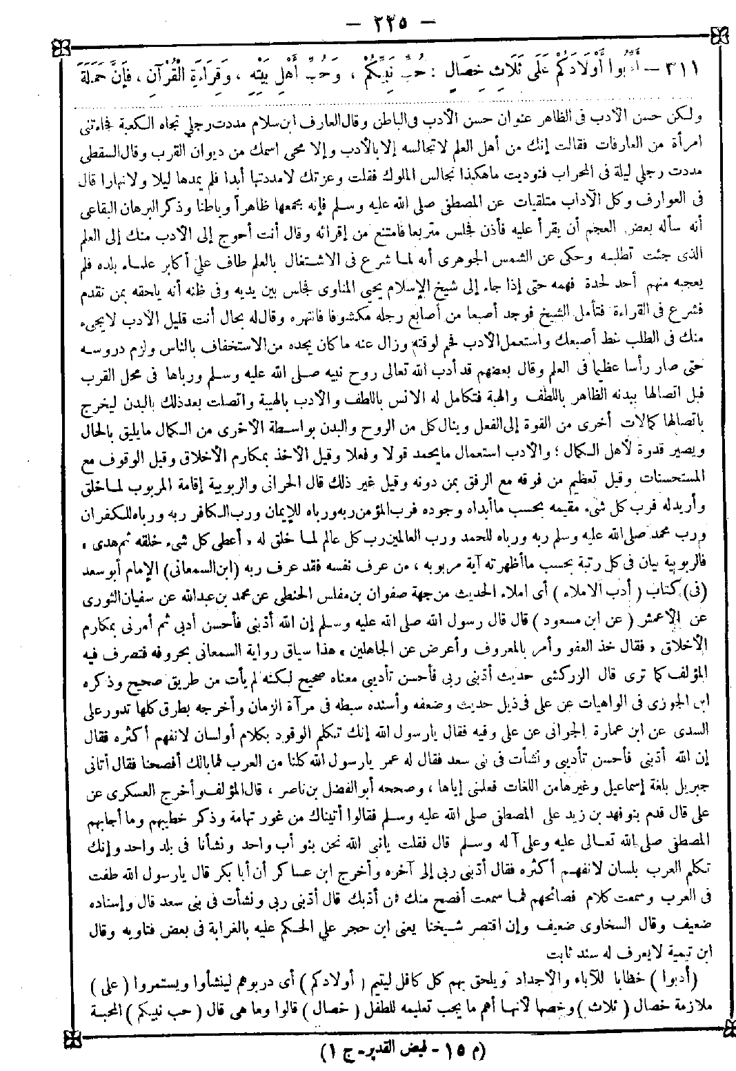 311 - (أدبوا) خطابا للآباء والأجداد ويلحق بهم كل كافل ليتيم (أولادكم) أي دربوهم لينشأوا ويستمروا (على) ملازمة خصال (ثلاث) وخصها لأنها أهم ما يجب تعليمه للطفل (خصال) قالوا: وما هي. قال: (حب نبيكم) المحبة -[226]- الإيمانية الطيبة لأنها غير اختيارية وهذا واجب لأن محبته تبعث على امتثال ما جاء به قال السمعاني: يجب على الآباء تعليم أولادهم أن النبي صلى الله عليه وسلم بعث بمكة إلى كافة الثقلين ودفن في المدينة وأنه واجب الطاعة والمحبة. وقال ابن القيم: يجب أن يكون أول ما يقرع سمعهم معرفة الله تعالى وتوحيده وأنه يسمع كلامهم وأنه معهم حيث ما كانوا وكذلك كان بنو إسرائيل يفعلون ولهذا كان أحب الأسماء عبد الله وعبد الرحمن بحيث إذا عقل الطفل ووعى علم أنه عبد الله ثم يعرفه النبي صلى الله تعالى عليه وسلم وبوجوب محبته (وحب أهل بيته) علي وفاطمة وبنيهما أو مؤمنو بني هاشم والمطلب (وقراءة القرآن) أي تلاوته ومدارسته وحفظه (فإن حملة القرآن) أي حفظته عن ظهر قلب المداومين لتلاوته العاملين بأحكامه يكونون (في ظل الله) أي في ظل عرشه كما صرح به في رواية أخرى (يوم لا ظل إلا ظله) أي يوم القيامة إذا دنت الشمس من الرؤوس واشتد عليهم حرها وقد يراد به ظل الجنة وهو نعيمها والكون فيها كما قال الله تعالى {وندخلهم ظلا ظليلا} وقيل: المراد بالظل الكرامة والكنف والأمن من المكاره في ذلك الموقف (مع أنبيائه وأصفيائه) أي يكونون في حزبه الذين اختارهم من خلقه وارتضاهم لجواره وقربه ومعنى كونه معهم أنه يكون رفيقا لهم هناك لاتصافه بصفتهم من حمل كتابه وفيه وجوب تأديب الأولاد وأنه حق لازم وكما أن للأب على ابنه حقا فللابن على أبيه كذلك بل وصية الله تعالى للآباء أبنائهم سابقة في التنزيل على وصية الأولاد بآبائهم فمن أهمل تعليم ولده وليدا ما ينفعه فقد أساء إليه وأكثر عقوق الأولاد آخرا بسبب الاهمال أولا ومن ثم قال بعضهم لأبيه: أضعتني وليدا فأضعتك شيخا