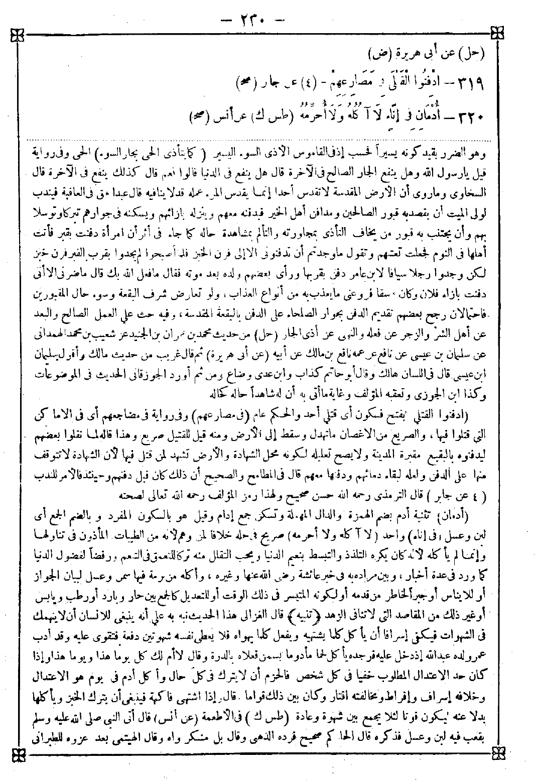 319 - (ادفنوا القتلى) بفتح فسكون أي قتلى أحد والحكم عام (في مصارعهم) وفي رواية في مضاجعهم أي في الأماكن التي قتلوا فيها والصريع من الأغصان ما تهدل وسقط إلى الأرض ومنه قيل للقتيل صريع وهذا قاله لما نقلوا بعضهم ليدفنوه بالبقيع مقبرة المدينة ولا يصح تعليله لكونه محل الشهادة والأرض تشهد لمن قتل فيها لأن الشهادة لا تتوقف منها على الدفن ولعله لبقاء دمائهم ودفنها معهم قال في المطامح والصحيح أن ذلك كان قبل دفنهم وحينئذ فالأمر للندب