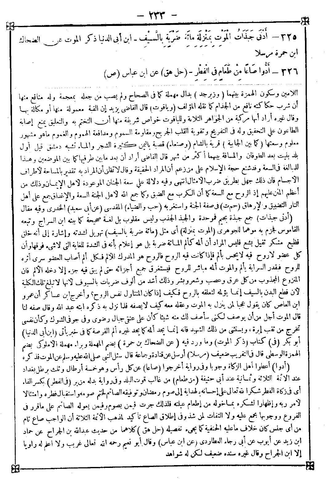 325 - (أدنى جبذات) جمع جبذة بجيم فموحدة والجبذ الجذب وليس مقلوب بل لغة صحيحة كما بينه ابن السراج وتبعه القاموس فجزم به موهما للجوهري (الموت بمنزلة) أي مثل (مئة ضربة بالسيف) تهويل لشدته وإشارة إلى أنه خلق فظيع منكر ثقيل بشع فليس المراد أن ألمه كألم المئة ضربة بل هو إعلام بأنه في الشدة للغاية التي لا شيء فوقها وأن كل عضو لا روح فيه لا يحس بألم فإذا كانت فيه الروح فالروح هو المدرك للألم فكل ألم أصاب العضو سرى أثره للروح فبقدر السراية يألم والموت ألمه مباشر للروح فيستغرق جميع أجزائه حتى لم يبق فيه جزء إلا دخله الألم فإن المنزوع المجذوب من كل عرق وعصب وشعر وبشر وذلك أشد من ألوف ضربات بالسيوف لأنها لا تبلغ تلك الكلية لأن قطع البدن بالسيف إنما يؤلمه لتعلقه بالروح فكيف إذا كان المتناول نفس الروح؟ وأخرج ابن عساكر أن عمرو ابن العاص كان يقول: عجبا لمن ينزل به الموت وعقله معه كيف لا يصفه فلما نزل به ذكره ابنه عبد الله وقال صفه لنا قال: الموت أجل من أن يوصف لكني سأصف لك منه شيئا كأن على عنقي جبال رضوى وفي جوفي الشوك وكأن نفسي تخرج من ثقب إبرة ويستثنى من ذلك الشهيد فإنه إنما يجد ألمه كما يجد غيره ألم القرصة كما في خبر يأتي