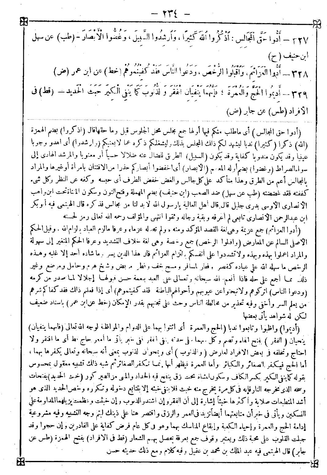 -[234]- 327 - (أدوا حق المجالس) أي ما طلب منكم فيها أولها جمع مجلس محل الجلوس قيل وما حقها قال (اذكروا) بضم الهمزة (الله) ذكرا (كثيرا) ندبا ليشهد لكم ذلك المجلس بذلك وليشغلكم ذكره عما لا يعنيكم (وارشدوا) أي اهدوا وجوبا عينيا وقد يكون مندوبا كفاية وقد يكون (السبيل) الطرق للضال عنه ضلالا حسيا أو معنويا والمرشد الهادي إلى سواء الصراط (وغضوا) بضم أوله المعمم (الأبصار) أي اخفضوا أبصاركم حذرا من الإفتتان بامرأة أو غيرها والمراد بالمجالس أعم من الطرق وهذا متأكد على كل جالس والغض خفض الطرف أي حبسه وكفه عن النظر وكل شيء كففته فقد غضضته