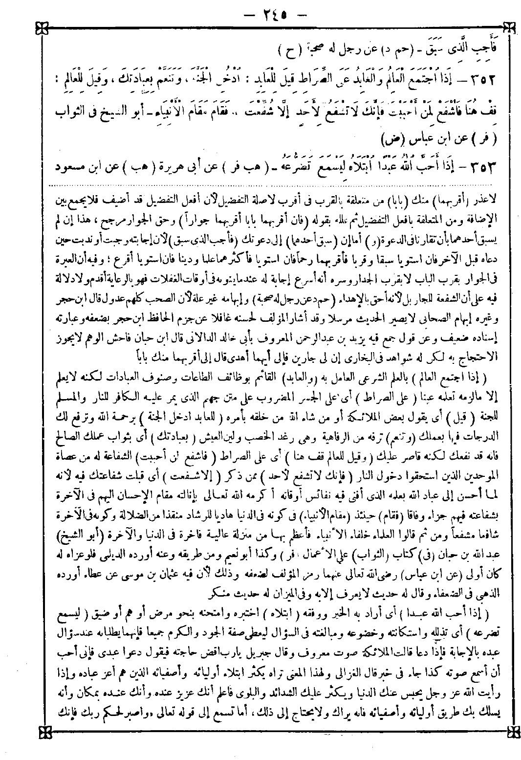 352 - (إذا اجتمع العالم) بالعلم الشرعي العامل به (والعابد) القائم بوظائف الطاعات وصنوف العبادات لكنه لا يعلم إلا ما لزمه تعلمه عينا (على الصراط) أي على الجسر المضروب على متن جهنم الذي يمر عليه الكافر للنار والمسلم للجنة (قيل) أي يقول بعض الملائكة أو من شاء الله من خلقه بأمره (للعابد أدخل الجنة) برحمة الله وترفع لك الدرجات فيها بعملك (وتنعم) ترفه من الرفاهية وهي رغد الخصب ولين العيش (بعبادتك) أي بثواب عملك الصالح فإنه قد نفعك لكنه قاصر عليك (وقيل للعالم قف هنا) أي على الصراط (فاشفع لمن أحببت) الشفاعة له من عصاة الموحدين الذين استحقوا دخول النار (فإنك لا تشفع لأحد) ممن ذكر (إلا شفعت) أي قبلت شفاعتك فيه لأنه لما أحسن إلى عباد الله بعلمه الذي أفنى فيه نفائس أوقاته أكرمه الله تعالى بإنالته مقام الإحسان إليهم في الآخرة بشفاعته قيهم جزاء وفاقا (فقام) حينئذ (مقام الأنبياء) في كونه في الدنيا هاديا للرشاد منقذا من الضلالة وكونه في الآخرة شافعا مشفعا ومن ثم قالوا العلماء خلفاء الأنبياء فأعظم بها من منزلة عالية فاخرة في الدنيا والآخرة