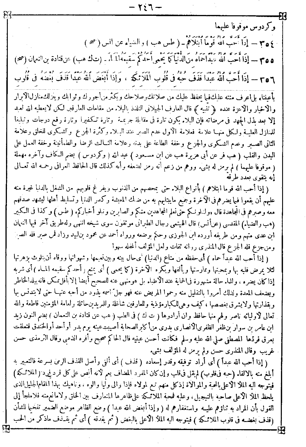354 - (إذا أحب الله قوما ابتلاهم) بأنواع البلايا حتى يمحصهم من الذنوب ويفرغ قلوبهم من الشغل بالدنيا غيرة منه عليهم أن يقعوا فيما يضرهم في الآخرة وجميع ما يبتليهم به من ضنك المعيشة وكدر الدنيا وتسليط أهلها ليشهد صدقهم معه وصبرهم في المجاهدة قال {ولنبلونكم حتى نعلم المجاهدين منكم والصابرين ونبلو أخباركم}