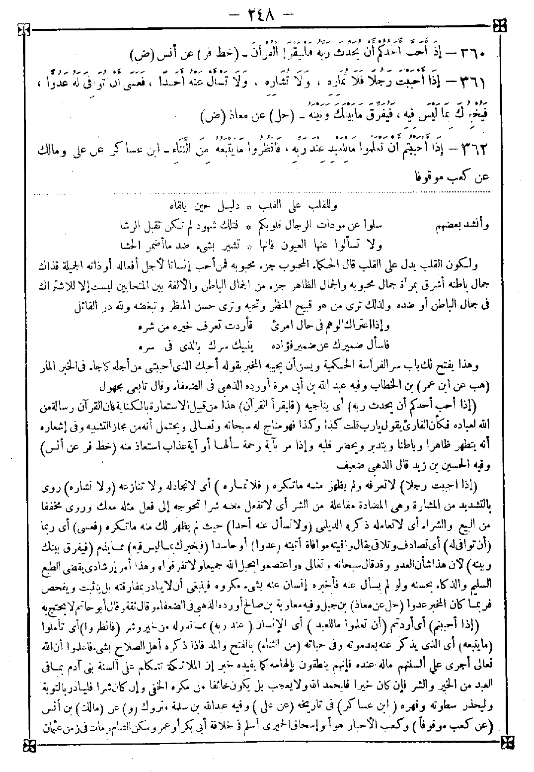 360 - (إذا أحب أحدكم أن يحدث ربه) أي يناجيه (فليقرأ القرآن) هذا من قبيل الاستعارة بالكناية فإن القرآن رسالة من الله لعباده فكأن القارئ يقول يارب قلت كذا وكذا فهو مناج له سبحانه وتعالى ويحتمل أنه من مجاز التشبيه وفي إشعاره أنه يتطهر ظاهرا وباطنا ويتدبر ويحضر قلبه وإذا مر بآية رحمة سألها أو آية عذاب استعاذ منه