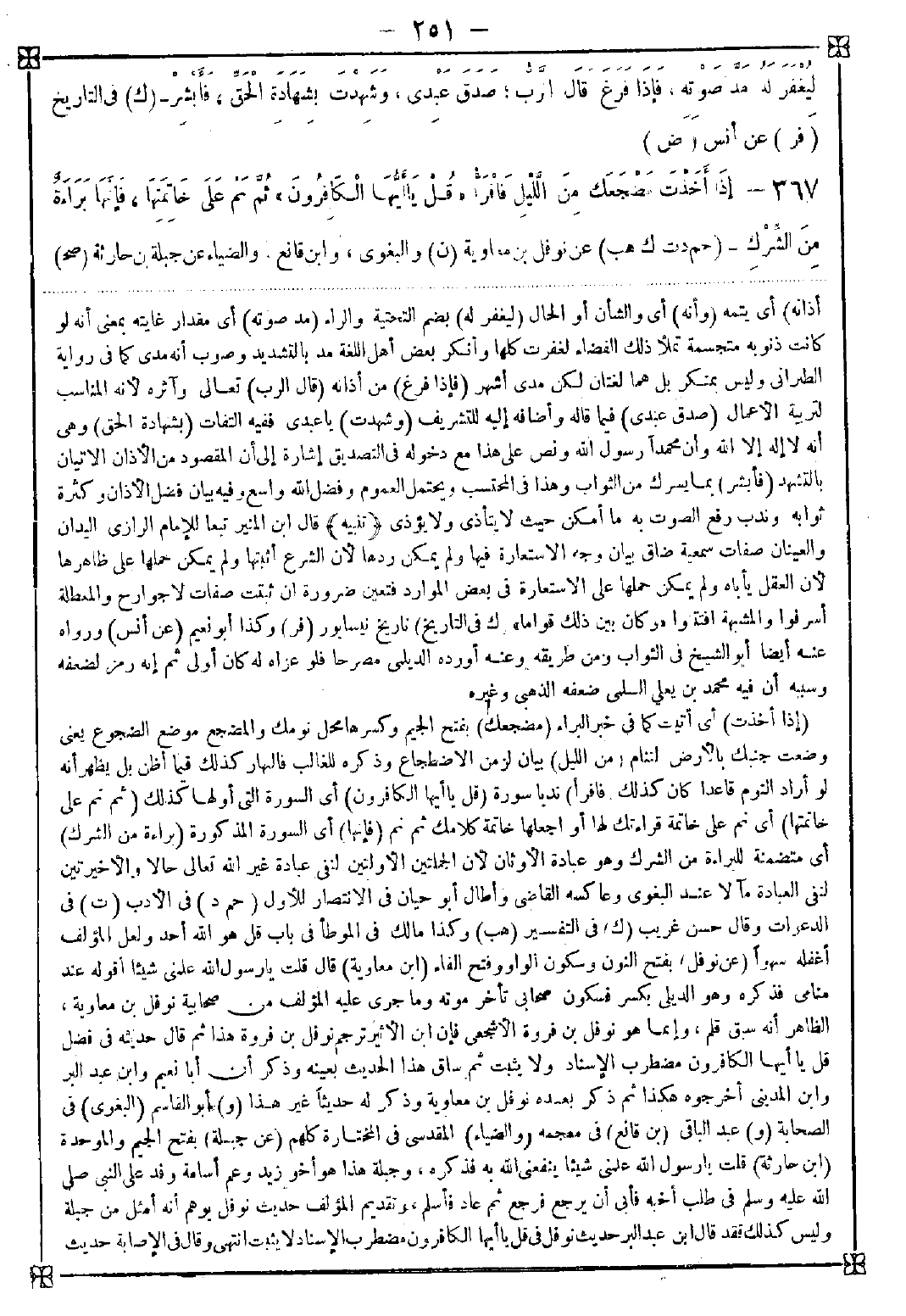 367 - (إذا أخذت) أي أتيت كما في خبر البراء (مضجعك) بفتح الجيم وكسرها محل نومك والمضجع موضع الضجوع يعني وضعت جنبك بالأرض لتنام (من الليل) بيان لزمن الاضطجاع وذكره للغالب فالنهار كذلك فيما أظن بل يظهر أنه لو أراد النوم قاعدا كان كذلك (فاقرأ) ندبا سورة (قل يا أيها الكافرون) أي السورة التي أولها كذلك (ثم نم على خاتمتها) أي نم على خاتمة قراءتك لها أو اجعلها خاتمة كلامك ثم نم (فإنها) أي السورة المذكورة (براءة من الشرك) أي متضمنة للبراءة من الشرك وهو عبادة الأوثان لأن الجملتين الأوليتين لنفي عبادة غير الله تعالى حالا والأخيرتين لنفي العبادة مآلا عند البغوي وعاكسه القاضي وأطال أبو حيان في الانتصار للأول
