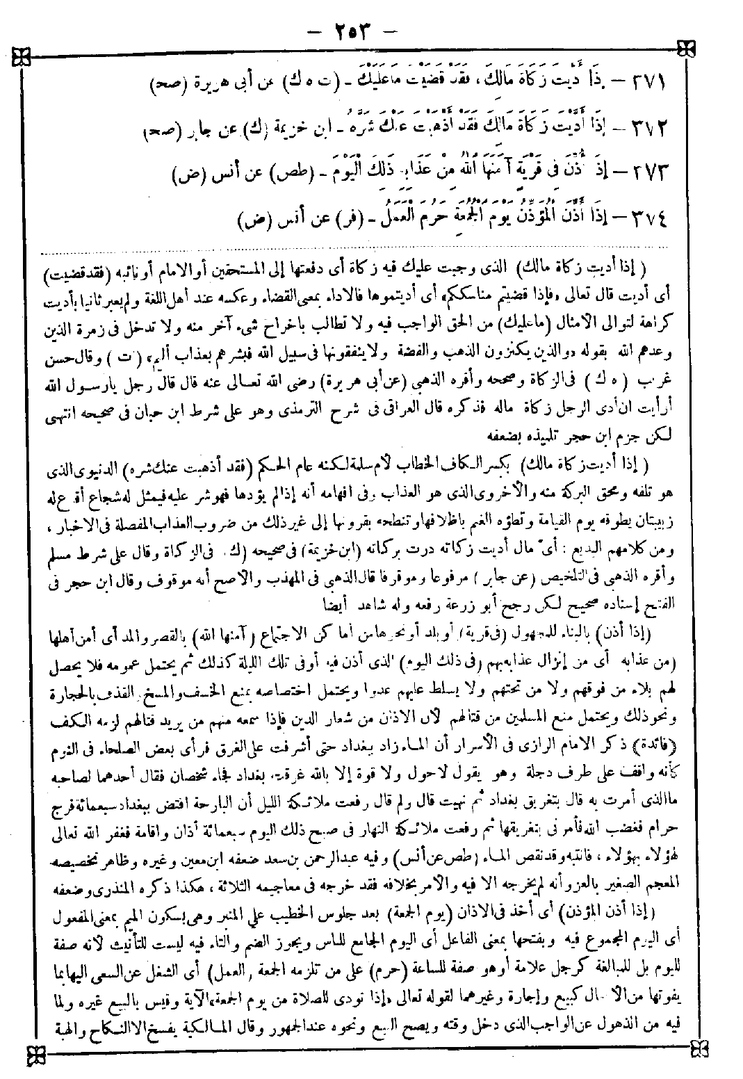 372 - (إذا أديت زكاة مالك) بكسر الكاف الخطاب لأم سلمة لكنه عام الحكم (فقد أذهبت عنك شره) الدنيوي الذي هو تلفه ومحق البركة منه والأخروي الذي هو العذاب وفي إفهامه أنه إذا لم يؤدها فهو شر عليه فيمثل له شجاع أقرع له زبيبتان يطوقه يوم القيامة وتطؤه الغنم بأظلافها وتنطحه بقرونها إلى غير ذلك من ضروب العذاب المفصلة في الأخبار ومن كلامهم البديع: أي مال أديت زكاته درت بركاته