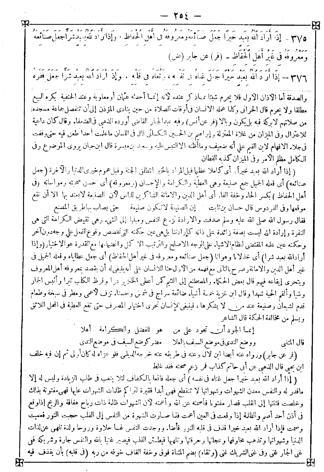 376 - (إذا أراد الله بعبد خيرا جعل غناه في نفسه) أي جعله قانعا بالكفاف لئلا يتعب في طلب الزيادة وليس له إلا ما قدر له والنفس معدن الشهوات وشهواتها لا تنقطع فهي أبدا فقيرة لتراكم ظلمات الشهوات عليها فهي مفتونة بذلك وخلصت فتنتها إلى القلب فصار مفتونا فأصمته عن الله وأعمته لأن الشهوات ظلمة ذات رياح هفافة والريح إذا وقع في أذن أحد أصم والظلمة إذا وقعت في العين أعمت فلما صارت الشهوة من النفس إلى القلب حجبت النور فعميت وصمت فإذا أراد الله بعبد خيرا قذف في قلبه النور فأضاء ووجدت النفس لها حلاوة وروحا ولذة تلهي عن لذات الدنيا وشهواتها وتذهب مخاوفها وعجلتها وحرقتها وتلهبها فيطمئن القلب فيصير غنيا بالله والنفس جارة وشريكة ففي غنى الجار غنى وفي غنى الشريك غنى (وتقاه) بضم المثناة فوق وخفة القاف خوفه من ربه (في قلبه) بأن يقذف فيه -[255]- نور اليقين فينخرق الحجاب ويضيء الصدر فذلك تقواه يتقي بها مساخط الله ويتقي بها حدوده. وبه يؤدي فرائض ربه وبه يخشاه فيصير ذلك النور وقايته (وإذا أراد الله بعبد شرا جعل فقره بين عينيه) كناية عن كونه يصير مستحضرا له أبدا ومشفقا من الوقوع فيه سرمدا فهو نصب عينيه على طول المدى فلا يزال فقير القلب حريصا على الدنيا متهافتا عليها منهمكا في تحصيلها وإن كان موسرا ممتد الطمع وإن طال الأمد فلا يزال بين طمع فارغ وأمل كاذب حتى توافيه المنية وهو على هذه الحالة الردية وذلك من علامات سوء الخاتمة والإرادة نزوع النفس وميلها إلى الفعل بحيث تحملها عليه وتقال للقوة التي هي مبدأ النزوع والأول مع الفعل والثاني قبله وكلاهما لا يتصور اتصاف الباري تبارك وتعالى به ولذلك اختلف العلماء في معنى إرادته فقيل إرادته الأفعال أنه غير ساه ولا مكره وقيل اشتمال الأمر على النظام الأكمل والوجه الأصلح والحق أنها ترجيح أحد مقدوريه على الآخر وتخصيصه بوجه دون وجه أو معنى يوجب هذا الترجيح ذكره القاضي