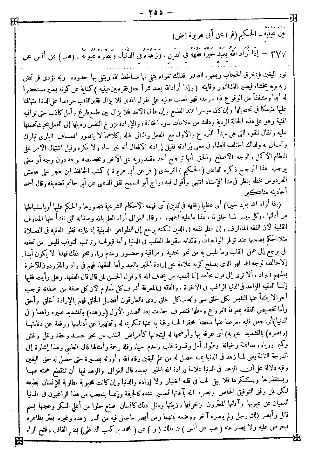 377 - (إذا أراد الله بعبد خيرا) أي عظيما (فقهه في الدين) أي فهمه الأحكام الشرعية بتصورها والحكم عليها أو باستنباطها من أدلتها وكل ميسر لما خلق له هذا ما عليه الجمهور قال الغزالي: أراد العلم بالله وصفاته التي تنشأ عنها المعارف القلبية لأن الفقه المتعارف وإن عظم نفعه في الدين لكنه يرجع إلى الظواهر الدينية إذ غايته نظر الفقيه في الصلاة مثلا الحكم بصحتها عند توفر الواجبات وفائدته سقوط الطلب في الدنيا وأما قبولها وترتب الثواب فليس من تعقله بل يرجع إلى عمل القلب وما تلبس به من نحو خشية ومراقبة وحضور وعدم رياء ونحو ذلك فهذا لا يكون أبدا إلا خالصا لوجه الله فهو الذي يصلح كونه علامة على إرادة الخير بالعبد وأما الفقهاء فهم في واد والمتزودون للآخرة بعلمهم في واد ألا ترى إلى قول مجاهد إنما الفقيه من يخاف الله؟ وقول الحسن لمن قال قال الفقهاء وهل رأيت فقيها إنما الفقيه الزاهد في الدنيا الراغب في الآخرة. والفقه في المعرفة أشرف كل معلوم لأن كل صفة من صفاته توجب أحوالا ينشأ عنها التلبس بكل خلق سني وتجنب كل خلق رديء فالعارفون أفضل الخلق فهو بالإرادة أخلق وأحق وأما تخصيص الفقه بمعرفة الفروع وعللها فتصرف حادث بعد الصدر الأول (وزهده) بالتشديد صيره زاهدا (في الدنيا) أي جعل قلبه معرضا عنها مبغضا محقرا لها رغبة به عنها تكريما له وتطهيرا عن أدناسها ورفعة عن دناءتها (وبصره) بالتشديد (عيوبه) أي عرفه بها وأوضحها له ليتجنبها كأمراض القلب من نحو حسد وحقد وغل وغش وكبر ورياء ومداهنة وخيانة وطول أمل وقسوة قلب وعدم حياء وقلة رحمة وأمثالها قال الطيبي: وهذا إشارة إلى الدرجة الثانية يعني لما زهد في الدنيا علامة إرادة الله الخير بعبده قال الغزالي: والزهد فيها أن تنقطع همته عنها ويستقذرها ويستنكرها فلا يبقى لها في قلبه اختيار ولا إرادة والدنيا وإن كانت محبوبة مطلوبة للإنسان بطبعه لكن لمن وفق التوفيق الخاص وبصره الله بآفاتها تصير عنده كالجيفة وإنما يتعجب من هذا الراغبون في الدنيا العميان عن عيوبها وآفاتها المغترون بزخرفها وزينتها ومثل ذلك كإنسان صنع حلوا من أغلى السكر وعجنها بسم قاتل وأبصر ذلك رجل ولم يبصره آخر ووضعه بينهما ومن أبصر ما جعل فيه من السم زهده وغيره يغتر بظاهره فيحرص عليه ولا يصبر عنه