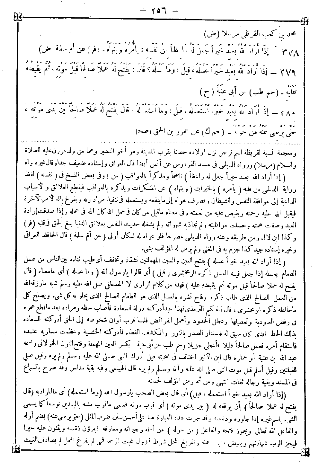 380 - (إذا أراد الله بعبد خيرا استعمله قيل) أي قال بعض الصحب يا رسول الله (وما استعمله) أي ما المراد به (قال يفتح له عملا صالحا) بأن يوفقه له (بين يدي موته) أي قرب موته فسمى ما قرب منه باليدين توسعا كما يسمى الشيء باسم غيره إذا جاوره ودنا منه وقد جرت هذه العبارة هنا على أحسن سنن ضرب المثل (حتى يرضى عنه) بضم أوله والفاعل الله تعالى ويجوز فتحه والفاعل (من حوله) من أهله وجيرانه ومعارفه فيبرؤن ذمته ويثنون عليه خيرا فيجيز الرب شهادتهم ويفيض عليه رحمته وتفريغ المحل شرط لدخول غيث الرحمة فمتى لم يفرغ المحل لم يصادف الغيث -[257]- محلا قابلا للنزول وهذا كمن أصلح أرضه لقبول الزرع ثم يبذر فإذا طهر العبد تعرض لنفحات رياح الرحمة ونزول الغيث في أوانه وحينئذ يكون جديرا بحصول الغلة <تنبيه> أشار المؤلف بالجمع بين هذين الحديثين في موضع إلى رد قول ابن العربي الرواية استعمله وأما عسله فهو تصحيف فبين أنه غير صحيح