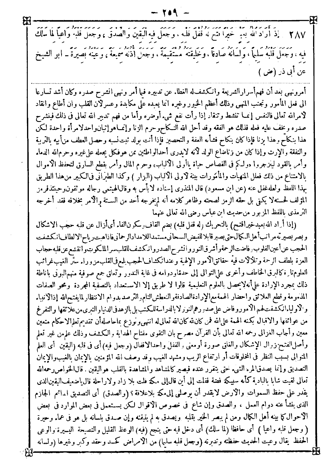 387 - (إذا أراد الله بعبد خيرا فتح) بالتحريك (له قفل قلبه) بضم القاف وسكون الفاء أي أزال عن قلبه حجب الأشكال وبصر بصيرته مراتب أهل الكمال حتى يصير قابلا للفيض السبحاني مستمدا للإمداد الرحمني فإذا هبت رياح الألطاف انكشفت الحجب عن أعين القلوب وفاضت الرحمة وأشرق النور وانشرح الصدر وانكشف للقلب سر الملكوت من وراء ستر الغيب غرائب العلوم تارة كالبرق الخاطف وأخرى على التوالي إلى حد ما وداومه في غاية الندور وتعلق جمع صوفية منهم البوني بإناطة ذلك بمجرد الإرادة على أنه لا يحصل بالعلوم التعليمية قالوا لا طريق إلا الاستعداد بالتصفية المجردة ومحو الصفات المذمومة وقطع العلائق واحضار الهمة مع الإرادة الصادقة والتعطش التام والترصد بدوام الانتظار لما يفتح الله إذ الأنبياء والأولياء انكشفت لهم الأمور وفاض على صدورهم النور لا بالدراسة للكتب بل بالزهد في الدنيا والتبري من علائقها والتفرغ من عوائقها والإقبال بكنه الهمة على الله فمن كان لله كان الله تعالى له انتهى ونوزع بما حاصله أن تقديم تعلم الأحكام متعين معين وأجاب الغزالي رحمه الله تعالى بأن القرآن مصرح بأن التقوى مفتاح الهداية والكشف وذلك علم من غير تعلم وأصل الفتح زوال الإشكال والغلق صورة أو معنى والقفل واحد الأقفال (وجعل فيه) أي في قلبه (اليقين) أي العلم المتوالي بسبب النظر في المخلوقات أو ارتفاع الريب ومشهد الغيب وقد وصف الله المؤمنين بالإيمان بالغيب والإيمان التصديق وإنما يصدق المرء الشيء حتى يتقرر عنده فيصير كالمشاهد والمشاهدة بالقلب هو اليقين. قال الخواص رحمه الله تعالى: لقيت شابا بالبادية كأنه سبيكة فضة فقلت إلى أين قال إلى مكة قلت بلا زاد ولا راحلة قال يا ضعيف اليقين الذي يقدر على حفظ السماوات والأرض لا يقدر أن يوصلني إلى مكة بلا علاقة؟ (والصدق) أي التصديق الدائم الجازم الذي ينشأ عنه دوام العمل والصدق وإن شاع في خصوص الأقوال لكن يستعمل في بعض الموارد في بعض الأحوال كما بينه أهل الكمال ومن لم يبصر الخير بقلبه ويصدق به لم يتيقنه وإن صدق بلسانه بل هو في عماء وحيرة (وجعل قلبه واعيا) أي حافظا (لما سلك) أي دخل فيه حتى ينجع (فيه) الوعظ القليل والنصيحة اليسيرة والوعي الحفظ يقال وعيت الحديث حفظته وتدبرته (وجعل قلبه سليما) من الأمراض كحسد وحقد وكبر وغيرها (ولسانه -[260]- صادقا) لتعظيم حرمته وتظهر ملاحته إذ اللسان الصادق من أعظم المواهب الربانية وبه يستقيم حال العبد في أحواله الدينية والدنيوية. قال الحراني: والصدق مطابقة ظاهر النطق والفعل بباطن الحال (وخليقته) سجيته وطبيعته مستقيمة معتدلة متوسطة بين طرفي الإفراط والتفريط والاستقامة كون الخط بحيث ينطق أجزاؤه المفروضة بعضها على بعض وفي إصلاح أهل الحقيقة الوفاء بالعهود وملازمة الطريق المستقيم برعاية حق التوسط في كل أمر ديني ودنيوي فذلك هو الصراط المستقيم (وجعل أذنه سميعة) صيغة مبالغة أي مستمعة لما ينفعه في الآخرة مقبلة على ما يسمعه من ذكر الله متأملة لنصوص كلامه مصغية لأوامره وزواجره وأحكامه (وعينه) أي عين قلبه (بصيرة) فيبصر بها ما جاء من الشارع ويتنبأ ويفهم وإن لم يفهم فانهتك عن قلبه ستر الغيوب فشهد الخير عيانا ولزم طريق الكتاب والسنة إيقانا ولم يلتبس عليه المنهاج الواضح المستبين فصار من المهتدين وخص هذه الجوارح بالذكر لأن منها يكون الخير والشر وعليها مدار النفع والضر. قال في الكشاف: والبصر نور العين وهو ما يبصر به المرئيات كما أن البصيرة نور القلب وهو ما يستبصر ويتأمل فكأنهما جوهران لطيفان خلقهما الله تعالى آلتين للإبصار وللإستبصار انتهى